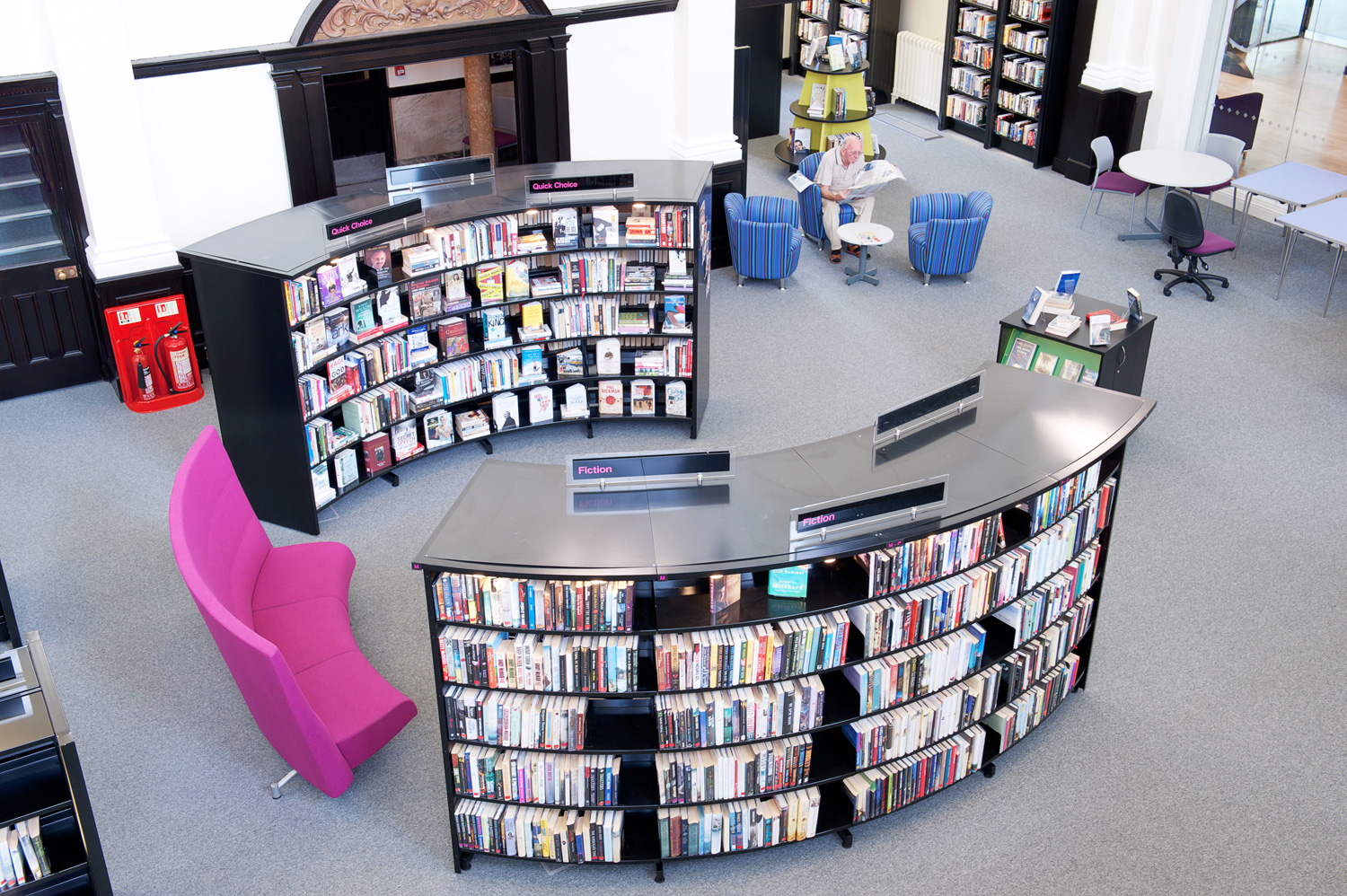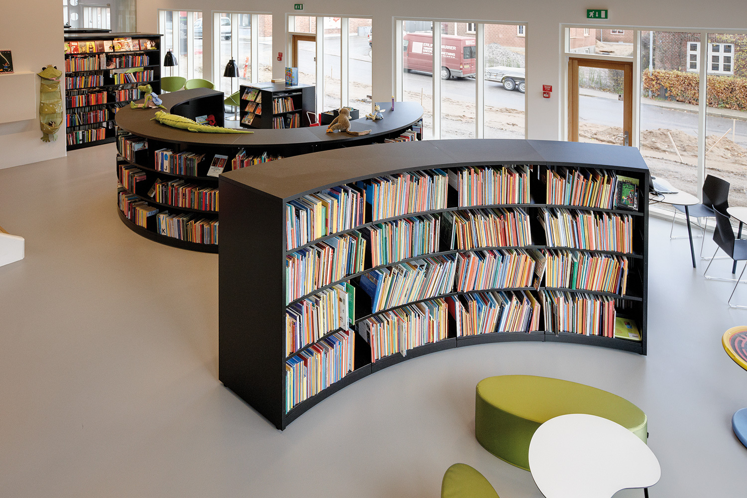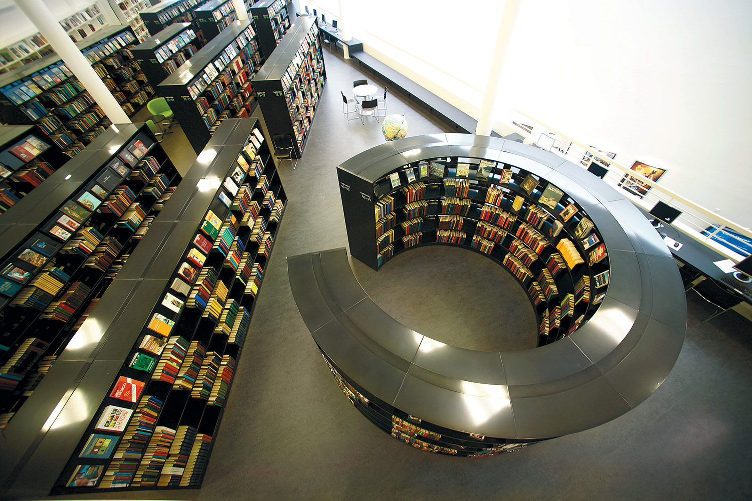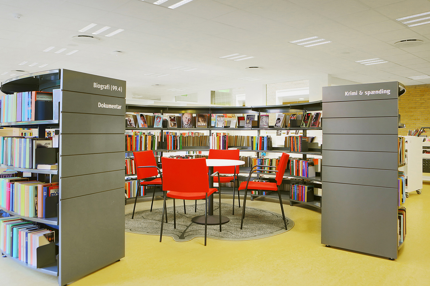 We offer special solutions to fit your library, e.g. a single-sided round shelving system combined with seating. See photos for inspiration and technical specifications under Downloads for more details.