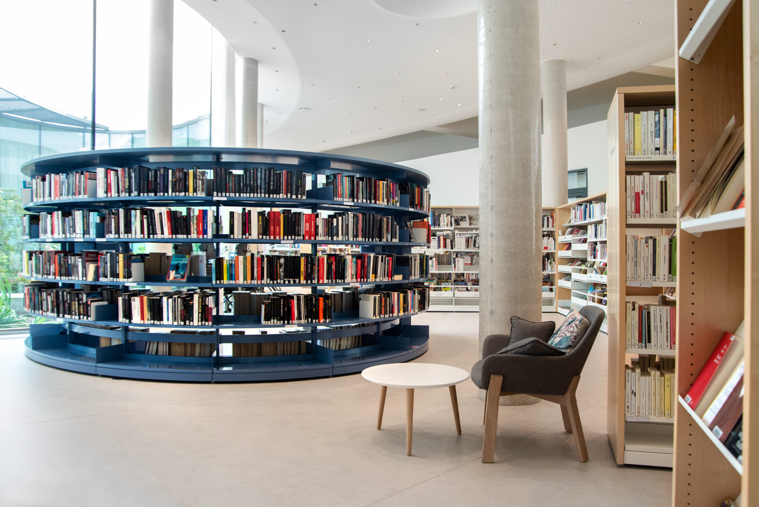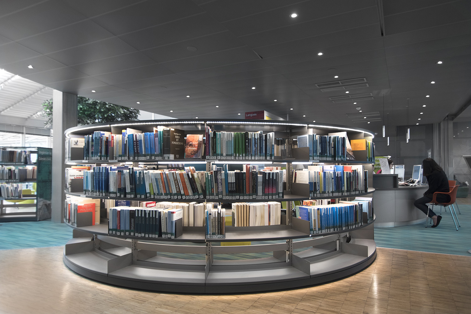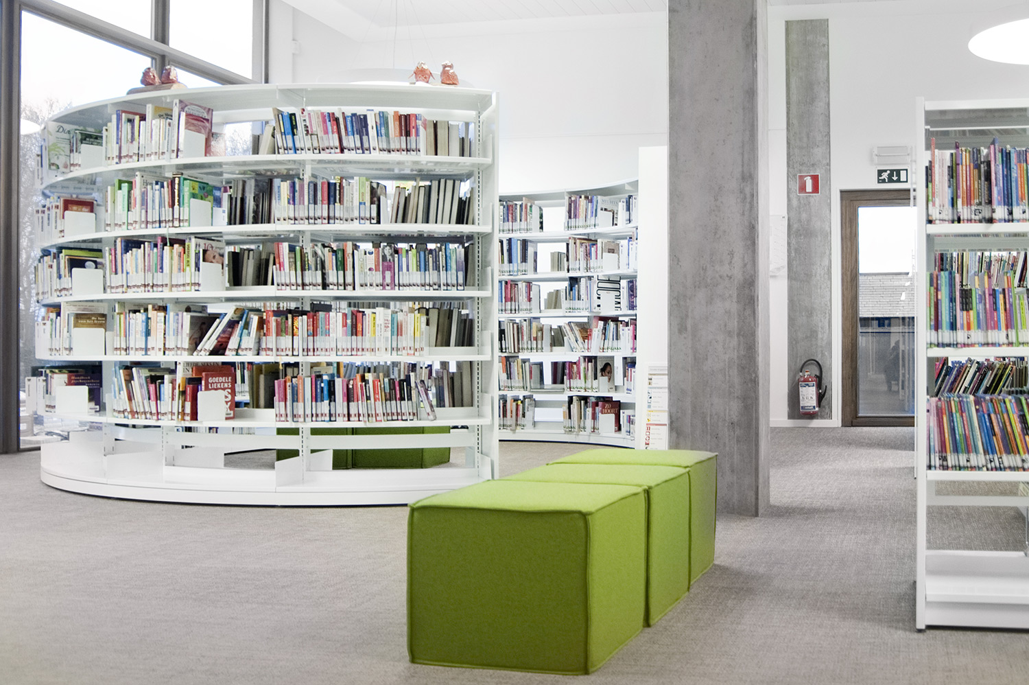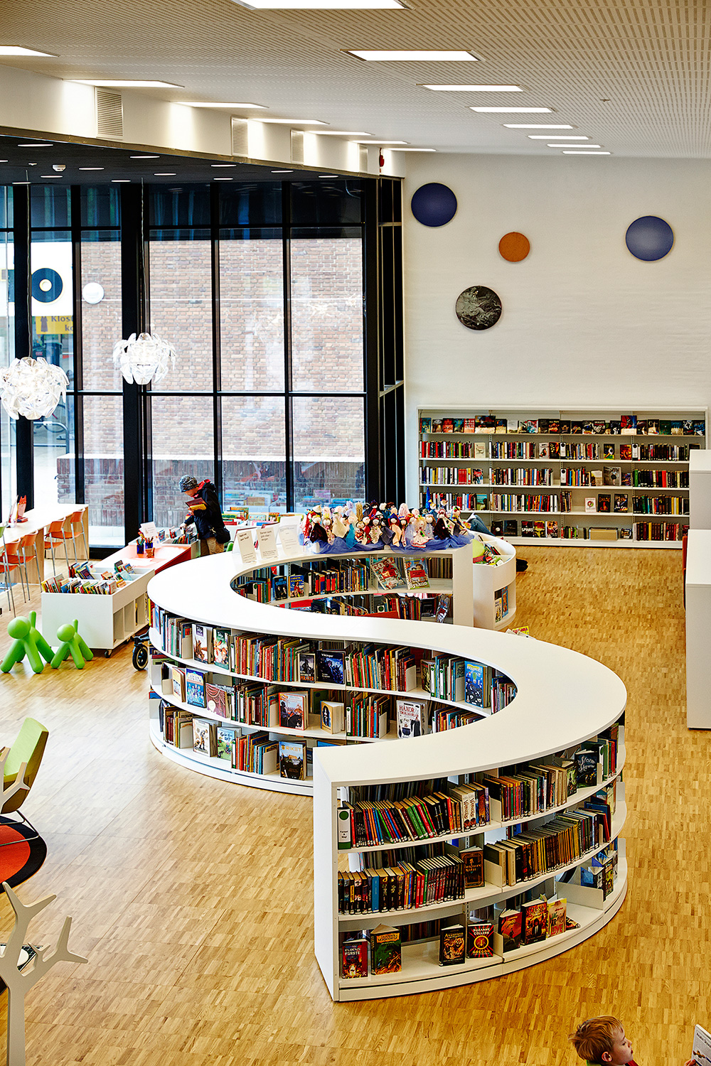 We offer special solutions to fit your library, e.g. a single-sided round shelving system combined with seating. See photos for inspiration and technical specifications under Downloads for more details.