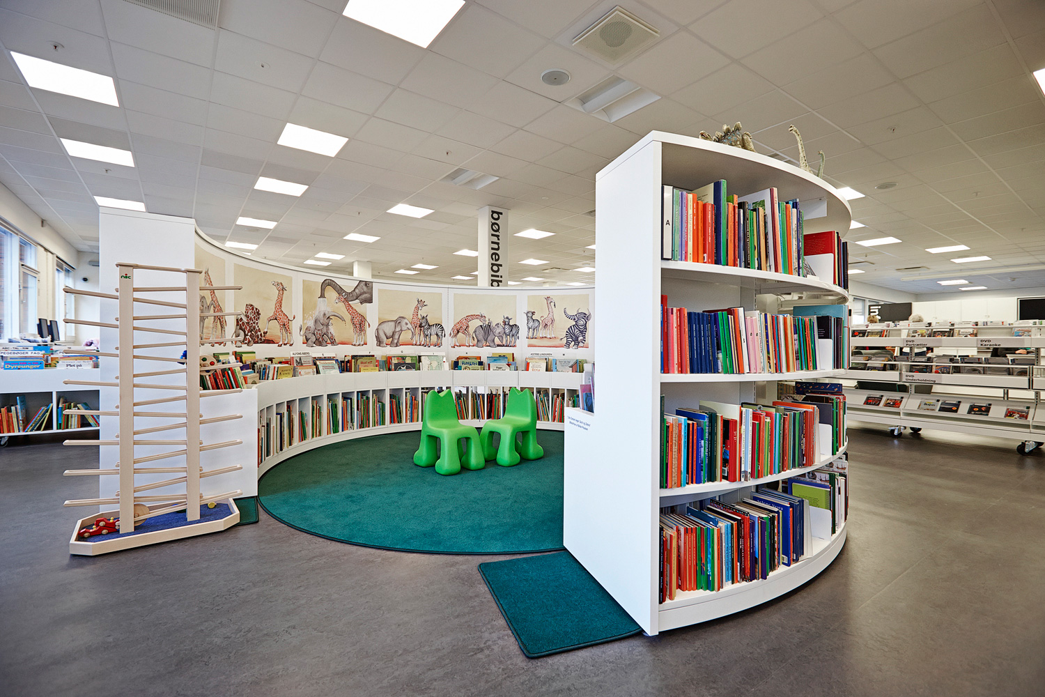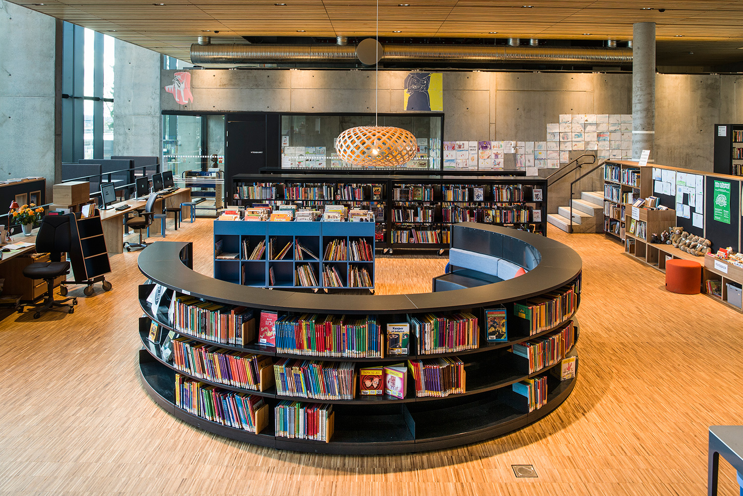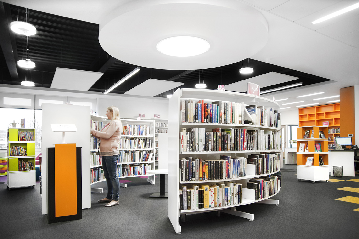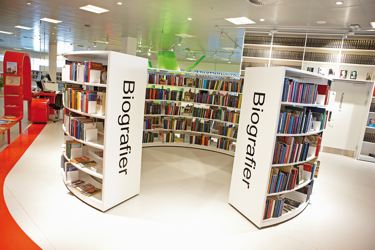 We offer special solutions to fit your library, e.g. a single-sided round shelving system combined with seating. See photos for inspiration and technical specifications under Downloads for more details.