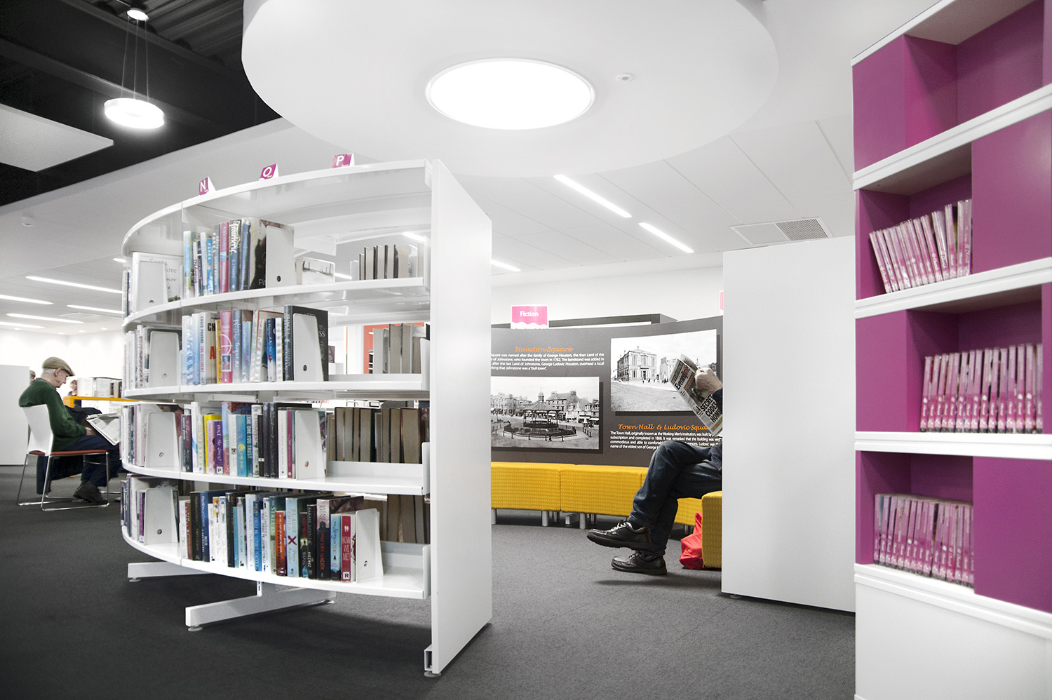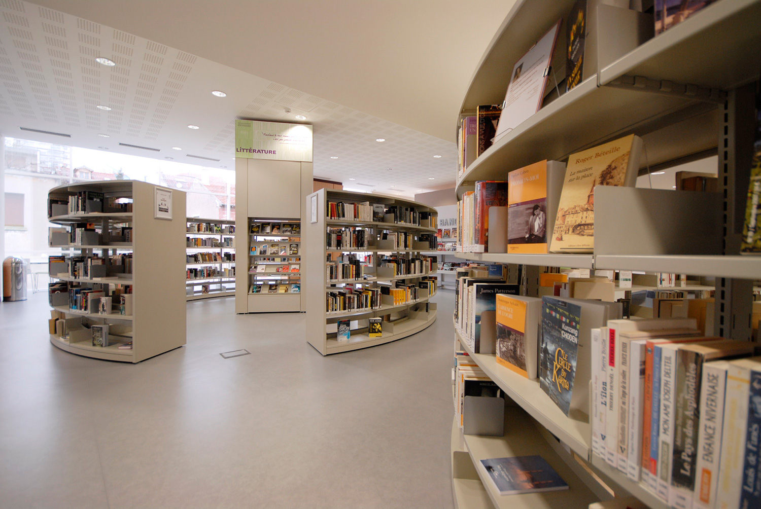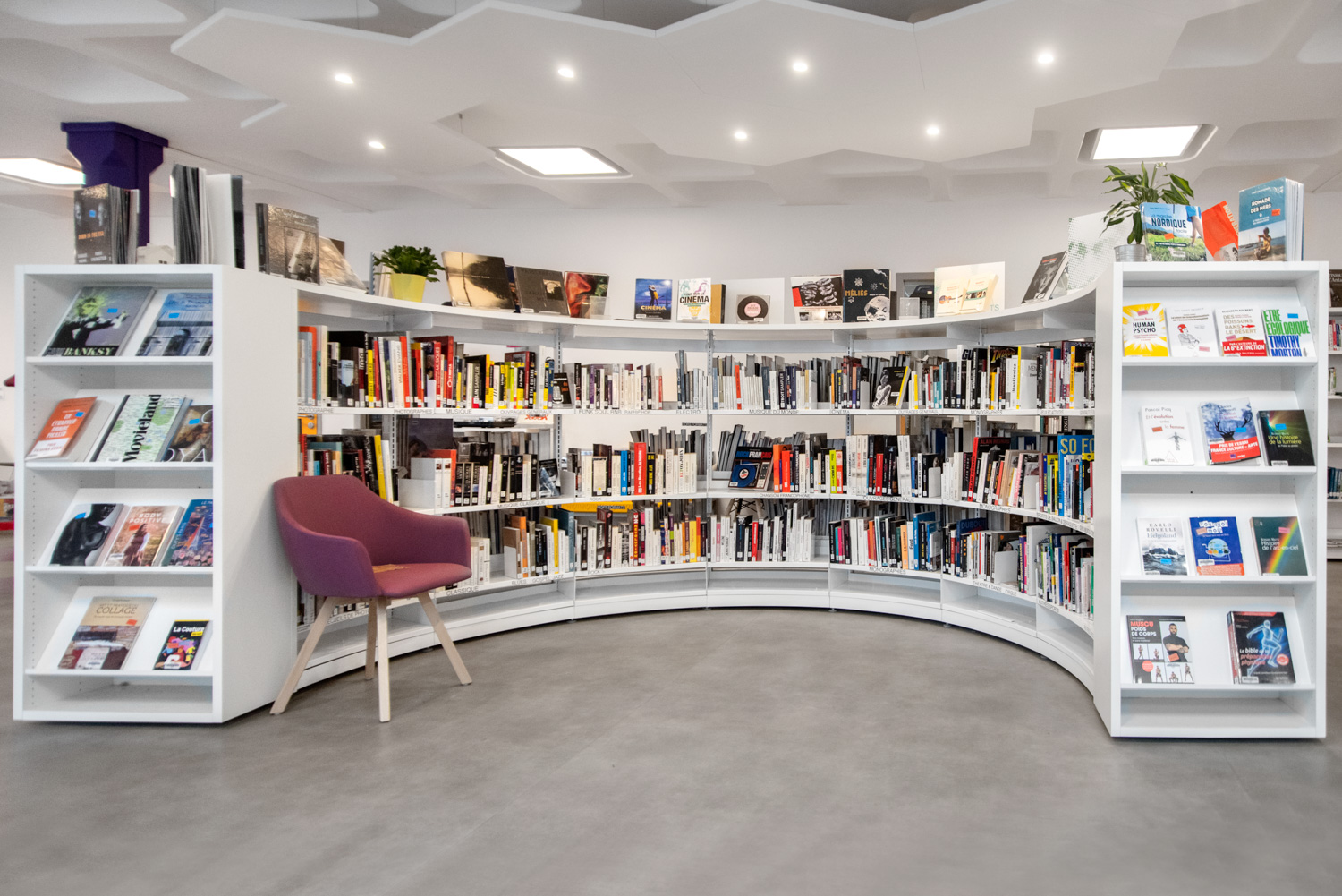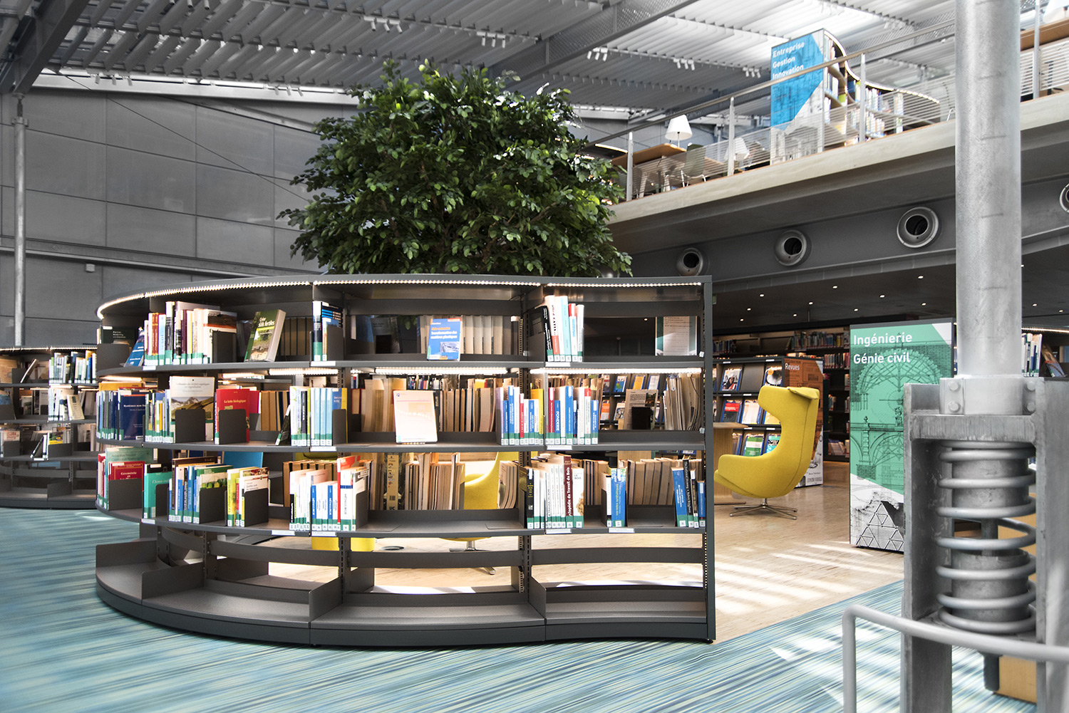 We offer special solutions to fit your library, e.g. a single-sided round shelving system combined with seating. See photos for inspiration and technical specifications under Downloads for more details.