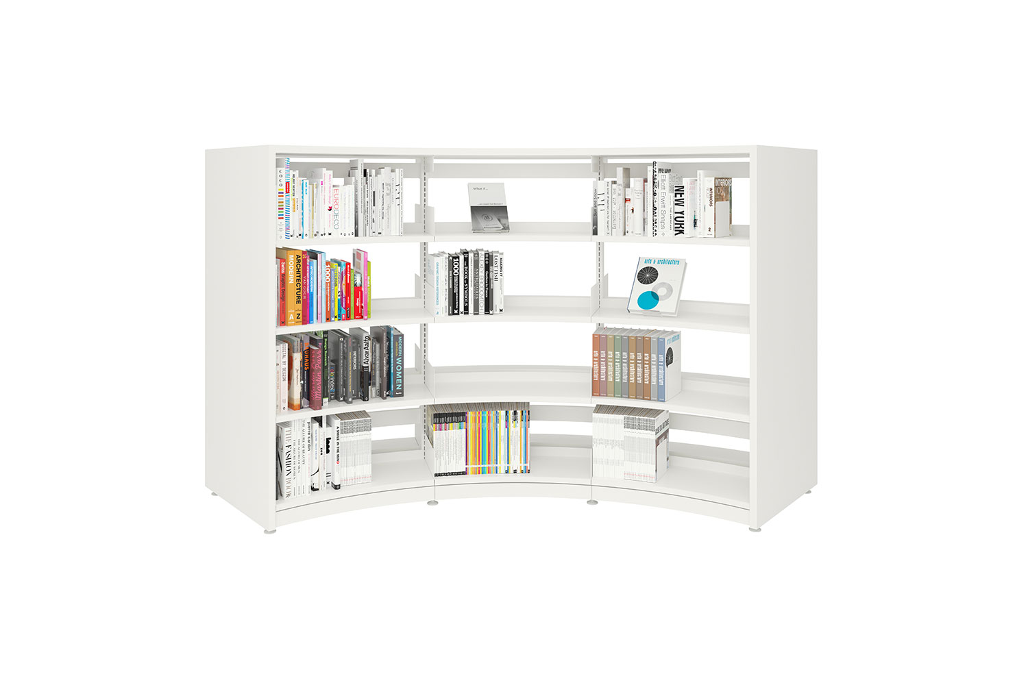 Use it as complete round shelving or use a number of bays for a curved expression. Create private spaces for children or quiet reading areas. Enhance specific topics or simply add the round shelving to diversify a simple, straight interior design.