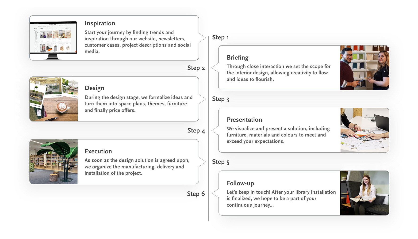 Our aim is to be a close partner and a source of inspiration throughout the journey towards a brand new or refurbished library.