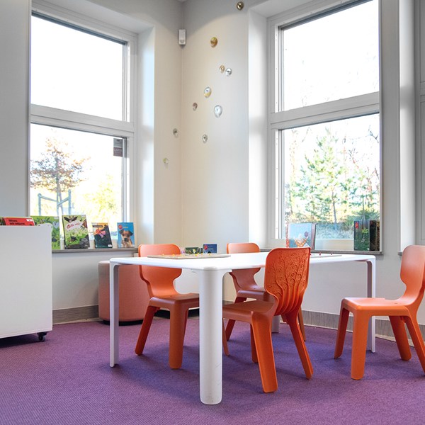 A light, stackable children’s chair with a unique seatback. The back is decorated with branches, leaves and even little birds here and there.
