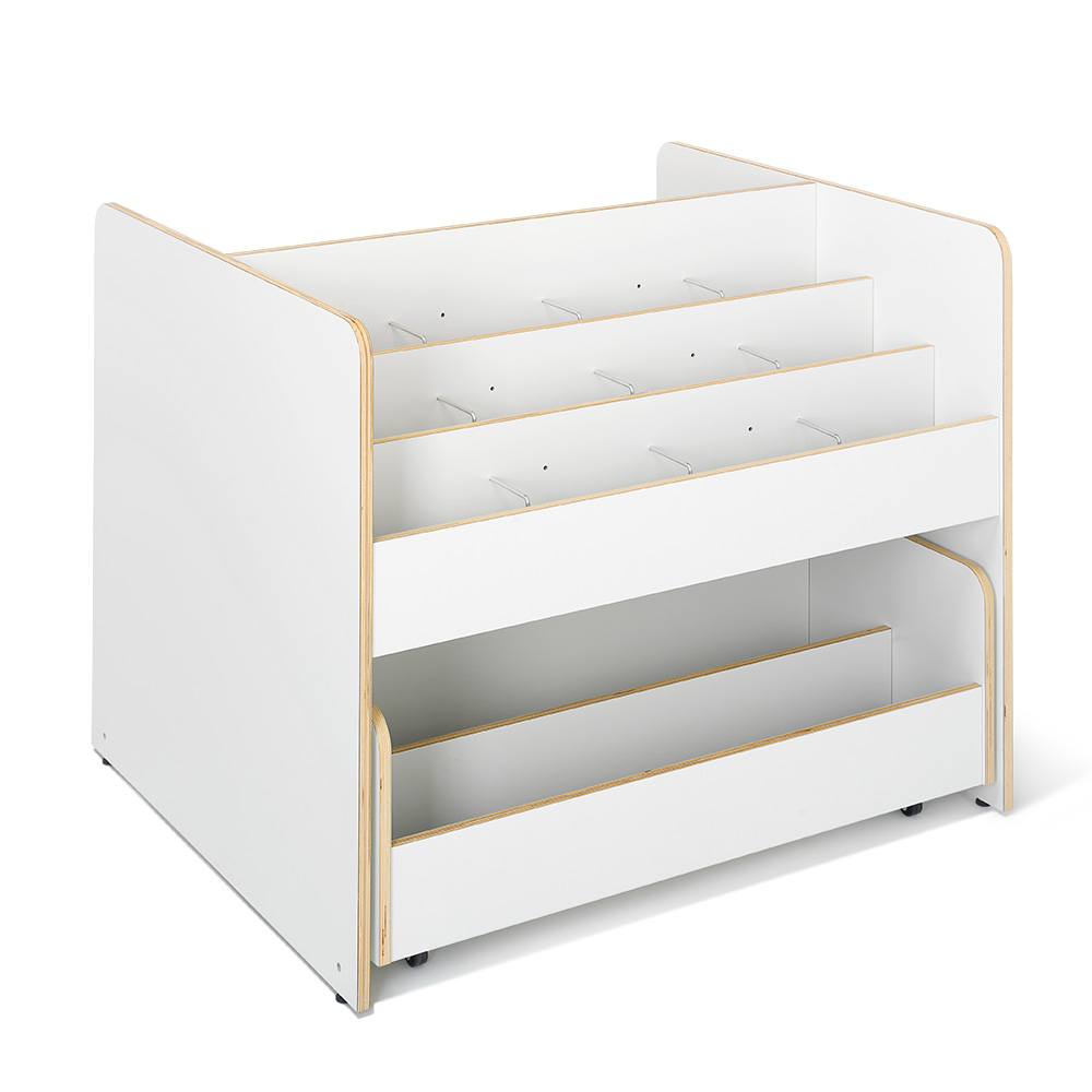 Popular, double-sided 3 tiered browser with 2 adjustable dividers and storage drawers with 2 compartments and castors underneath on both sides.