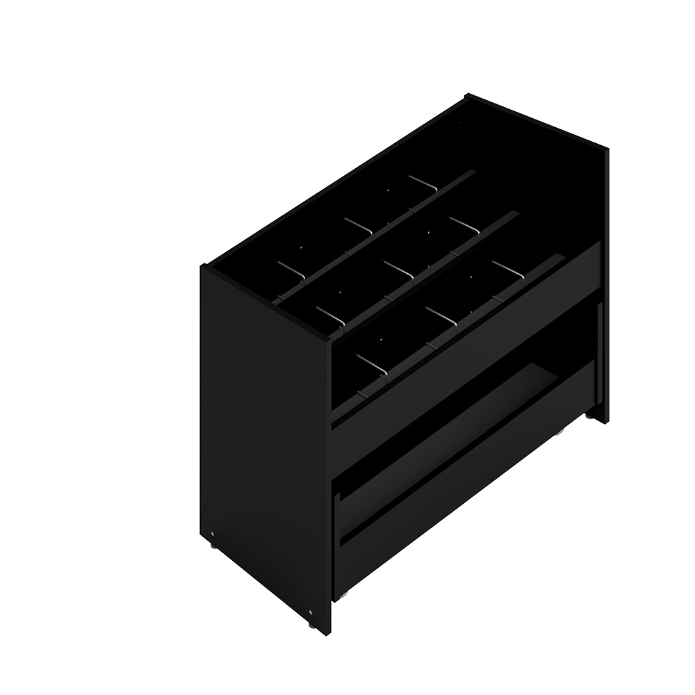 Popular 3 tiered browser with 2 adjustable dividers and a storage drawer with 2 compartments and castors underneath.