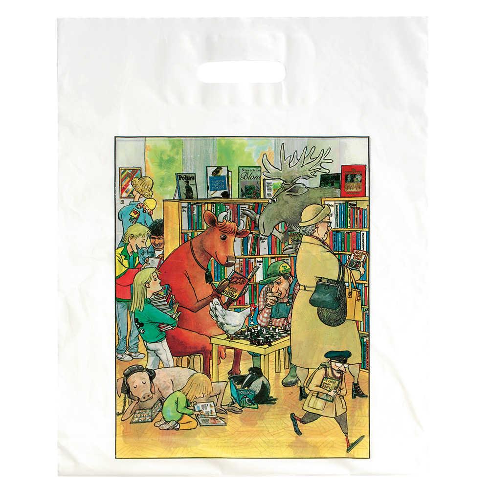 To facilitate library visits, we have sourced plastic carrier bags with fun and inspiring designs; all of which are a loving tribute to books and their readers! Here you will find an array of motives created with love by some of Sweden’s most well-known cartoonists and graphic designers.