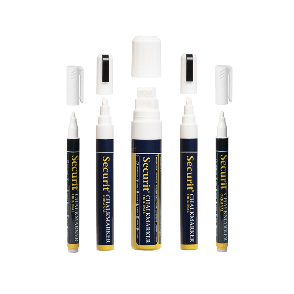 Set with 5 chalkmarker pens which can be used on all smooth surfaces such as blackboards, whiteboards, signs and glass.
