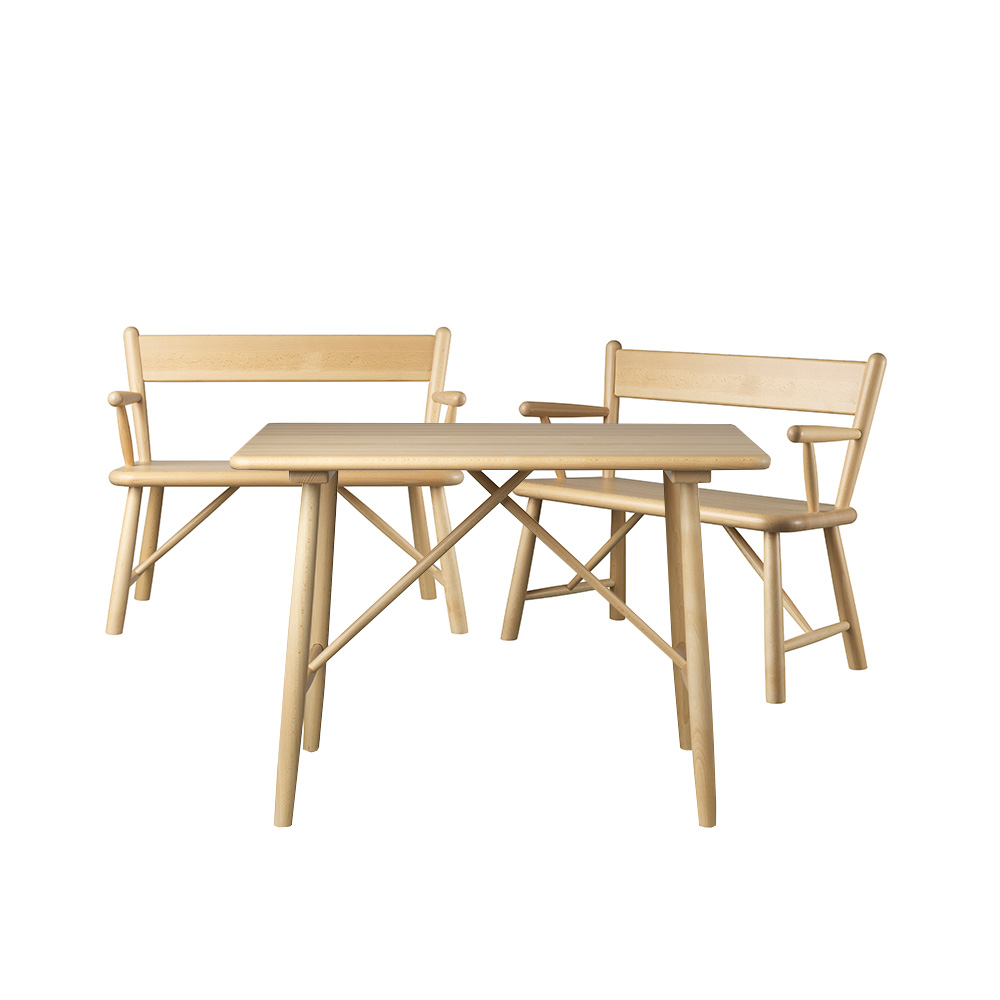 The furniture is made of lacquered beech and requires minimal maintenance. It can easily be cleaned by wiping it with a damp cloth.