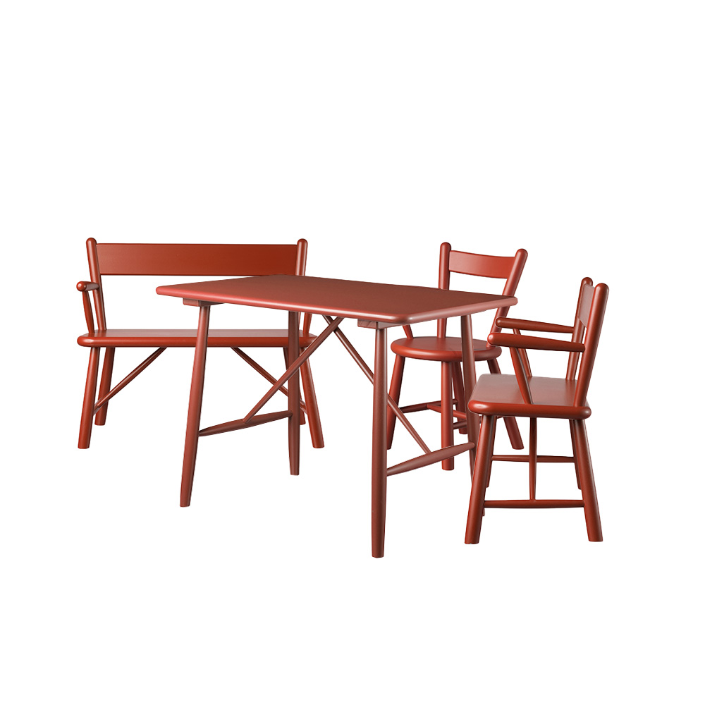 The furniture is made of lacquered beech and requires minimal maintenance. It can easily be cleaned by wiping it with a damp cloth.