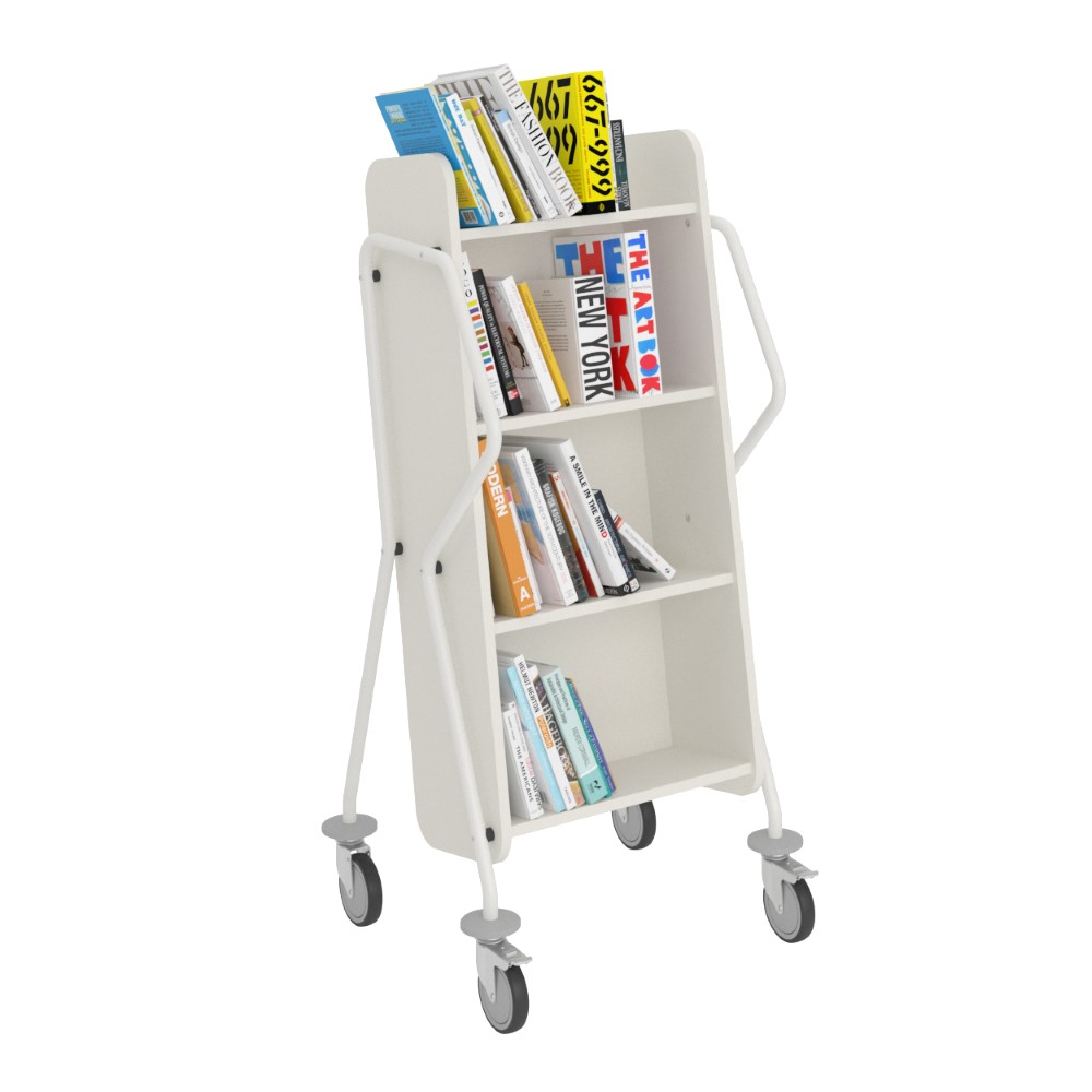 Ergonomic, user-friendly, single-sided book trolley with 4 shelves. Generous amount of clearance between shelves to accommodate larger books.