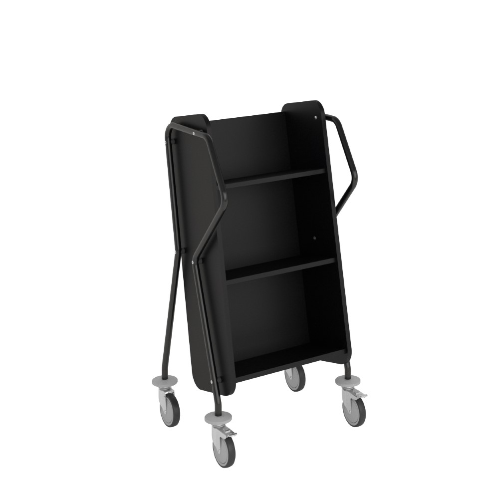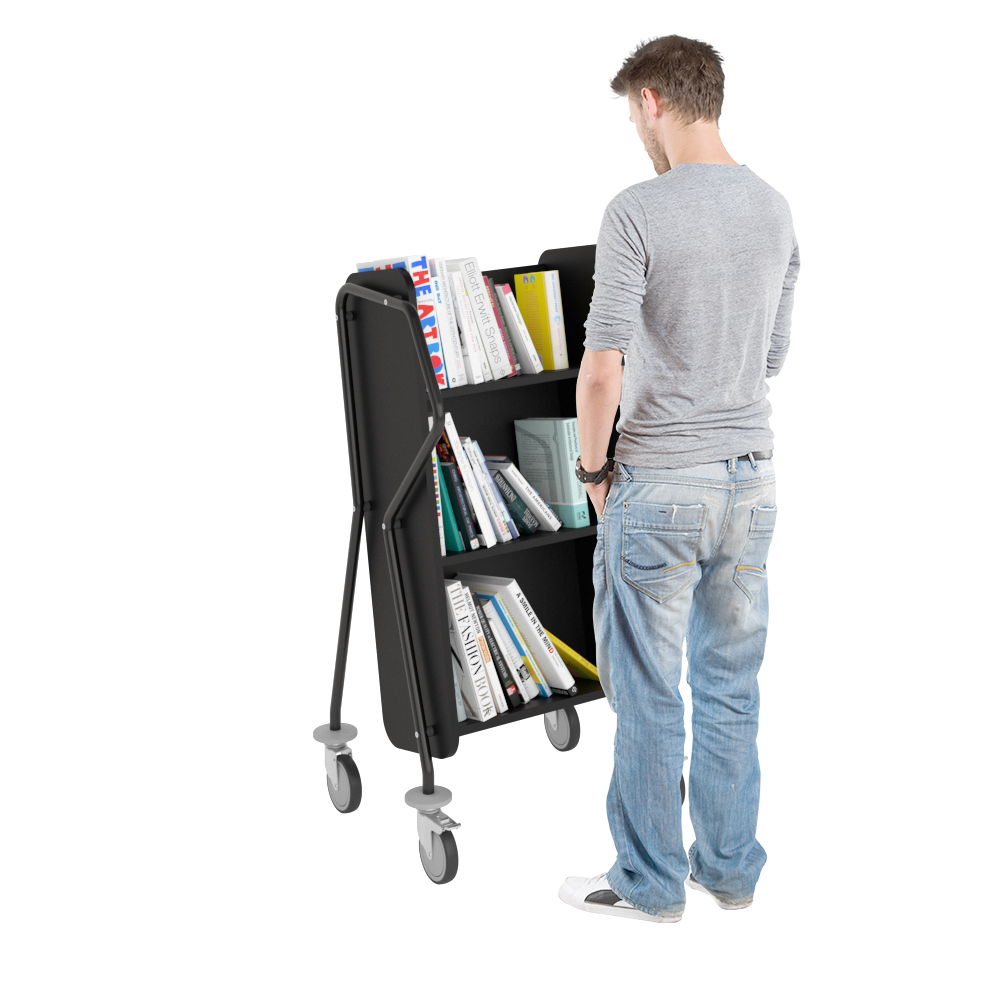 Ergonomic, user-friendly, single-sided book trolley with 3 shelves. Generous amount of clearance between shelves to accommodate larger books.