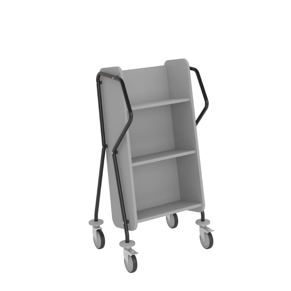 Ergonomic, user-friendly, single-sided book trolley with 3 shelves. Generous amount of clearance between shelves to accommodate larger books.