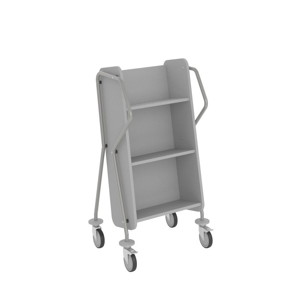 Ergonomic, user-friendly, single-sided book trolley with 3 shelves. Generous amount of clearance between shelves to accommodate larger books.