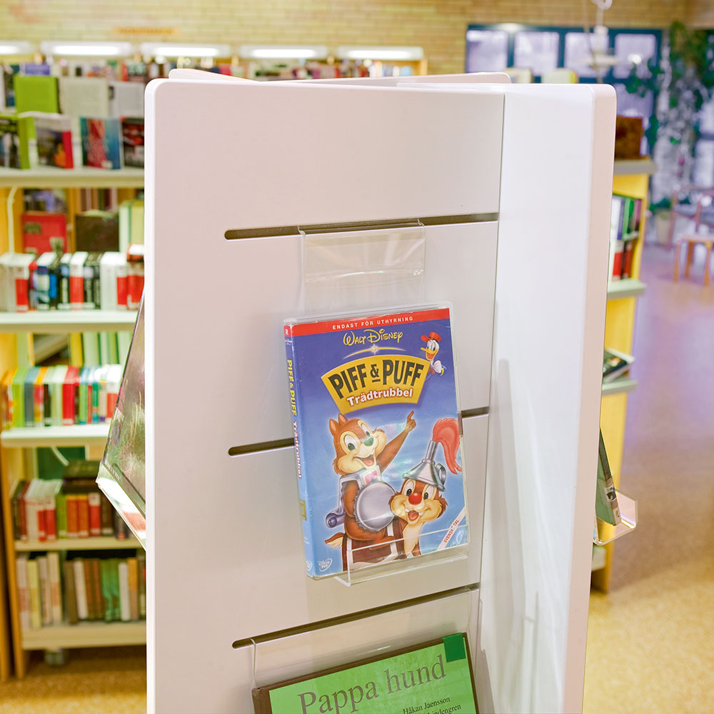 The displays are easily moved around to create flexible display solutions for books, AV-media such as CD/DVDs, magazines, brochures, etc.