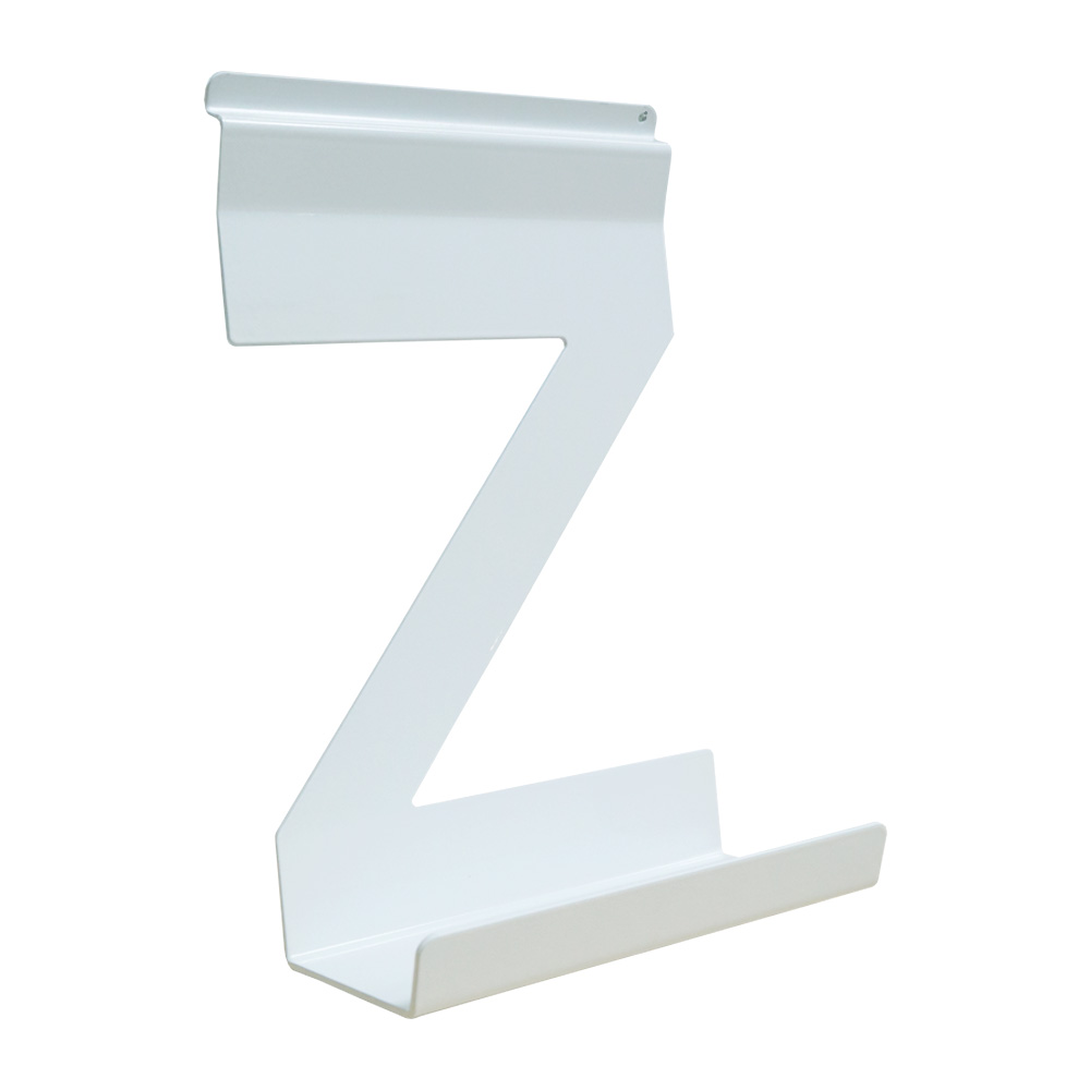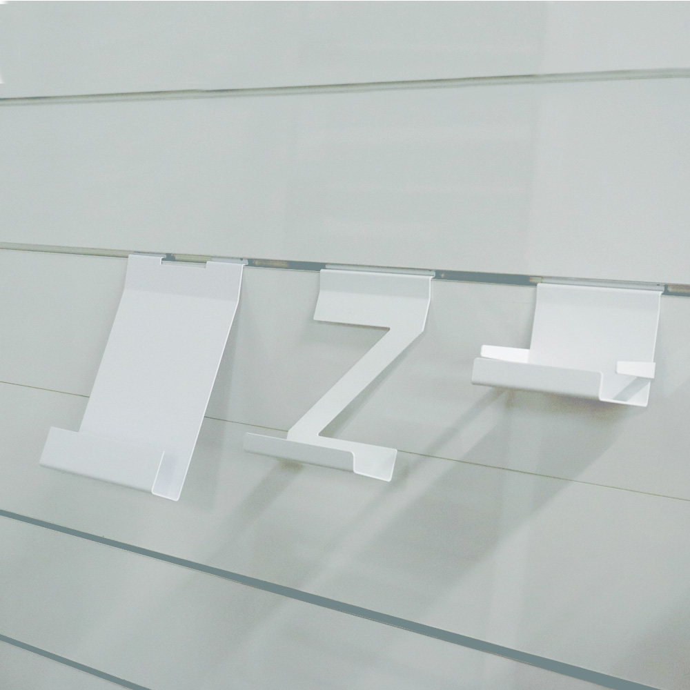 A collection of solid steel holders suitable for slat display panels and Quattro book tower.
