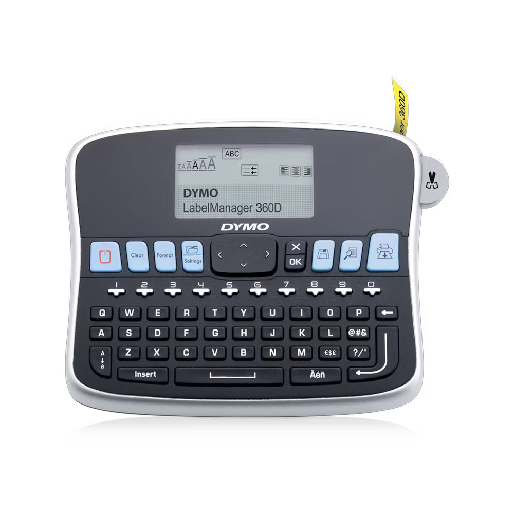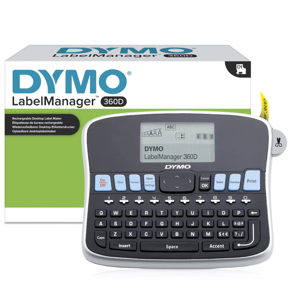 The Dymo 360D is compatible with D1 marking tapes in 6, 9, 12 and 19 mm. It features a larger display and even more functionality.