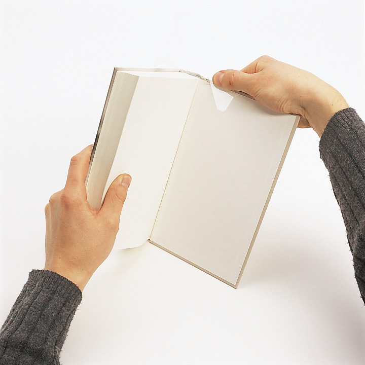 Self-adhesive book spine strengtheners with patented center perforations for easy positioning.