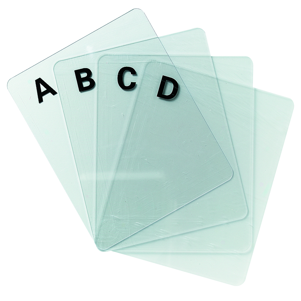 Practical index tabs with text in durable, transparent acrylic for AV-media.