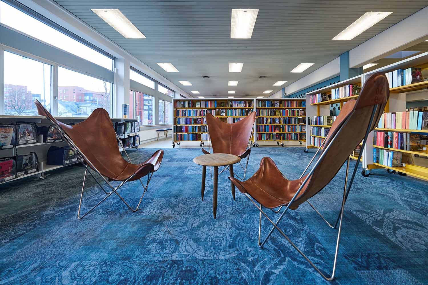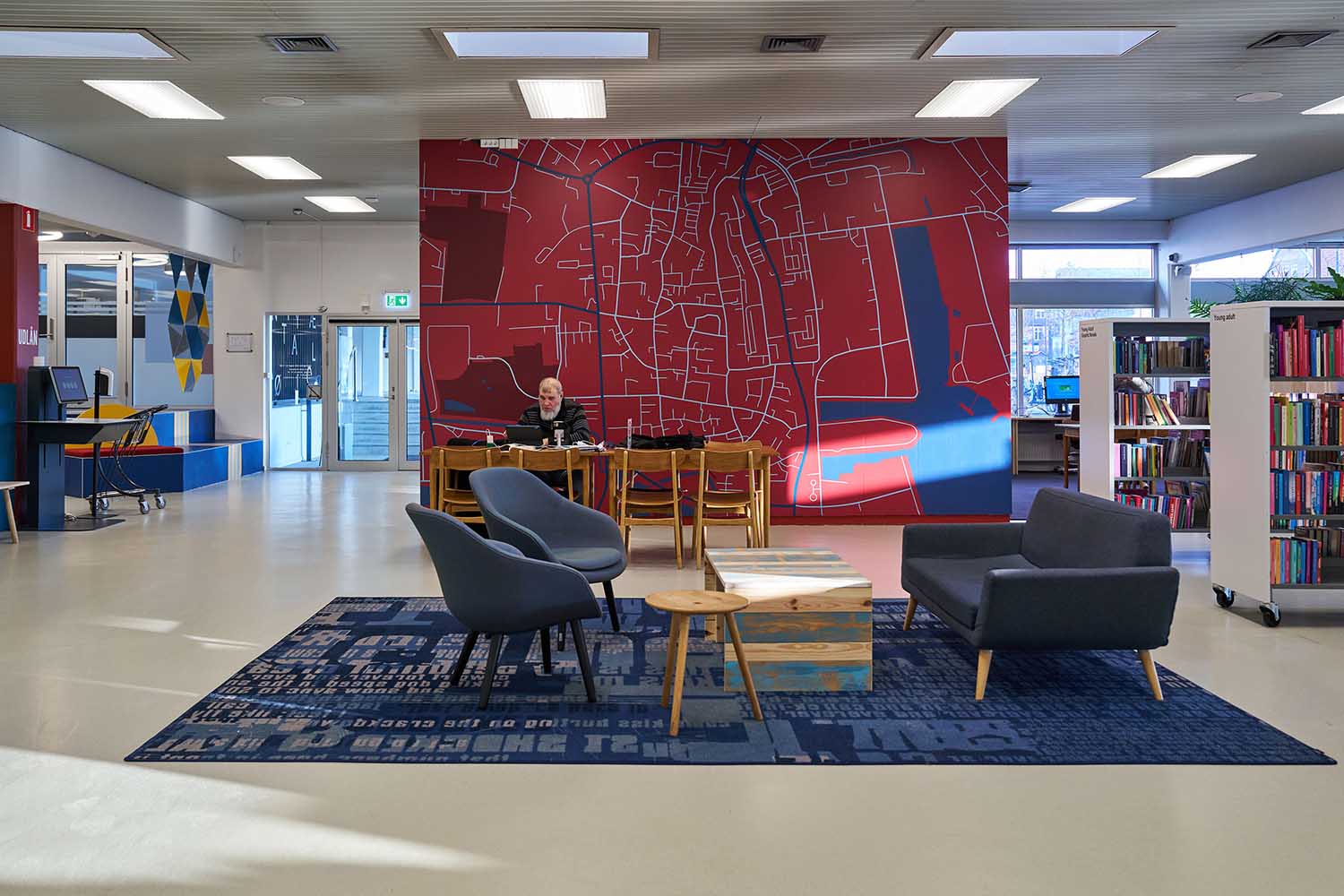 Shelving has been rebuilt into smaller, mobile sections on castors, making the library flexible and easy to reconfigure for events and changing needs. Throughout the library, carefully selected wall colours, graphic solutions, and carpets have been introduced to give the entire building new life. The richly coloured carpets, with thoughtfully chosen patterns, help create a vibrant and inspiring library while adding a homely sense of comfort that opens the spaces and makes it feel welcoming.