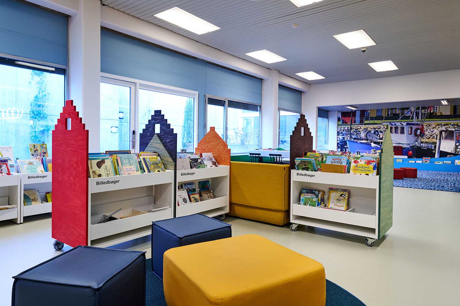 The children’s universe is completed by a reading tree and a small “reading forest”, encouraging calm moments, closeness, and shared reading. The existing white picture-book browsers have been given new coloured end panels, and small seating spots have been integrated between the browsers so children and their families can sit right in the middle of the literary landscape.