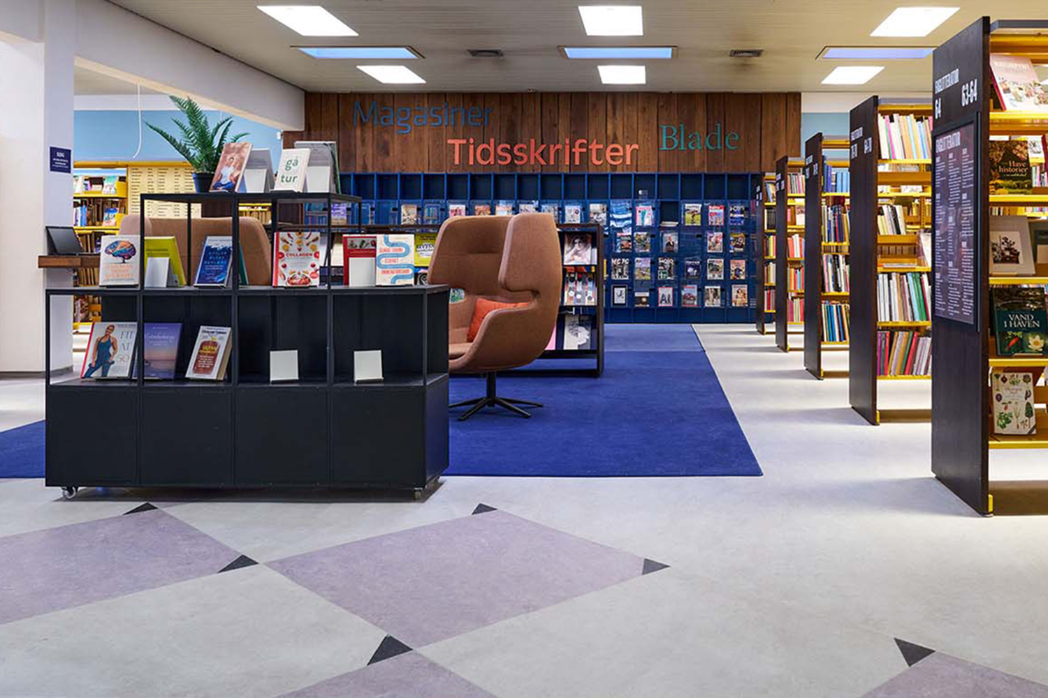 The re-design focus of Horsens Library was to retain and upcycle the “striking” yellow shelving! By wrapping the shelving with anthracite grey panels, we created a modern contrast between old and new.