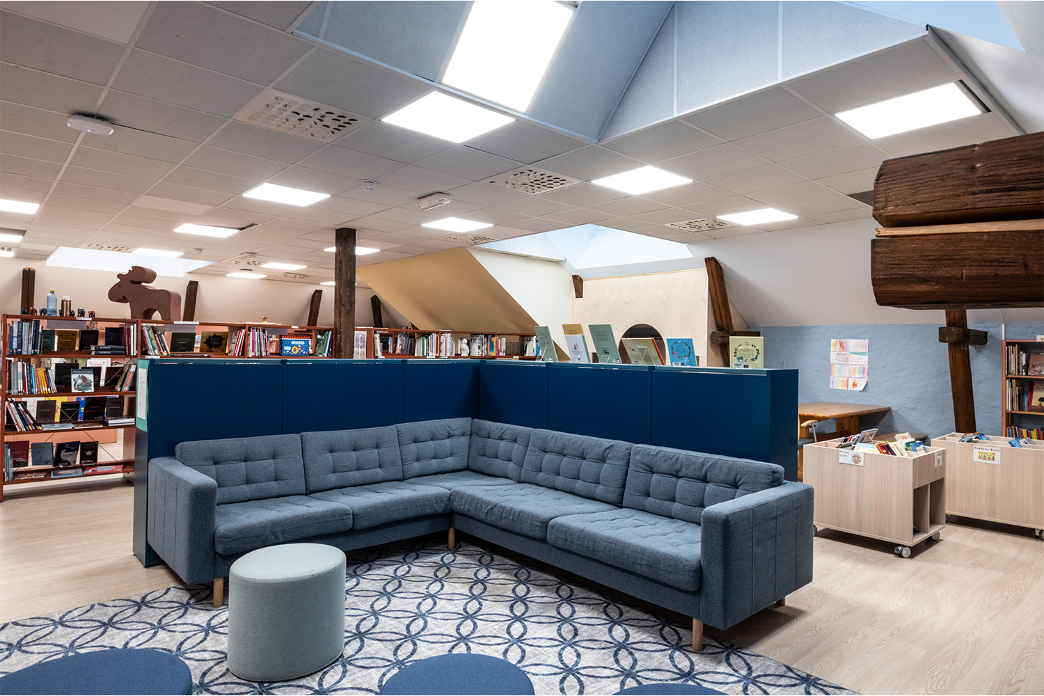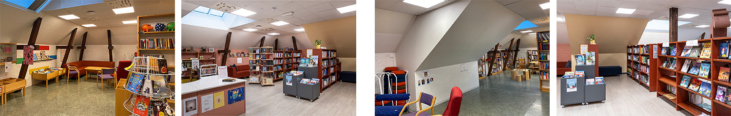 Located on the fourth floor, with sloping ceilings and exposed wooden beams, the library’s warm wall and shelving colours create a welcoming and comfortable atmosphere.