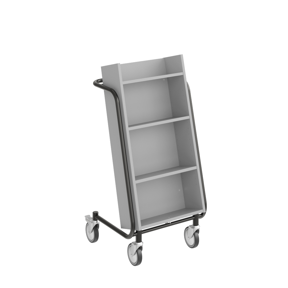 User-friendly, single-sided book trolley with 4 shelves. The two middle shelves are adjustable to accommodate various media sizes.