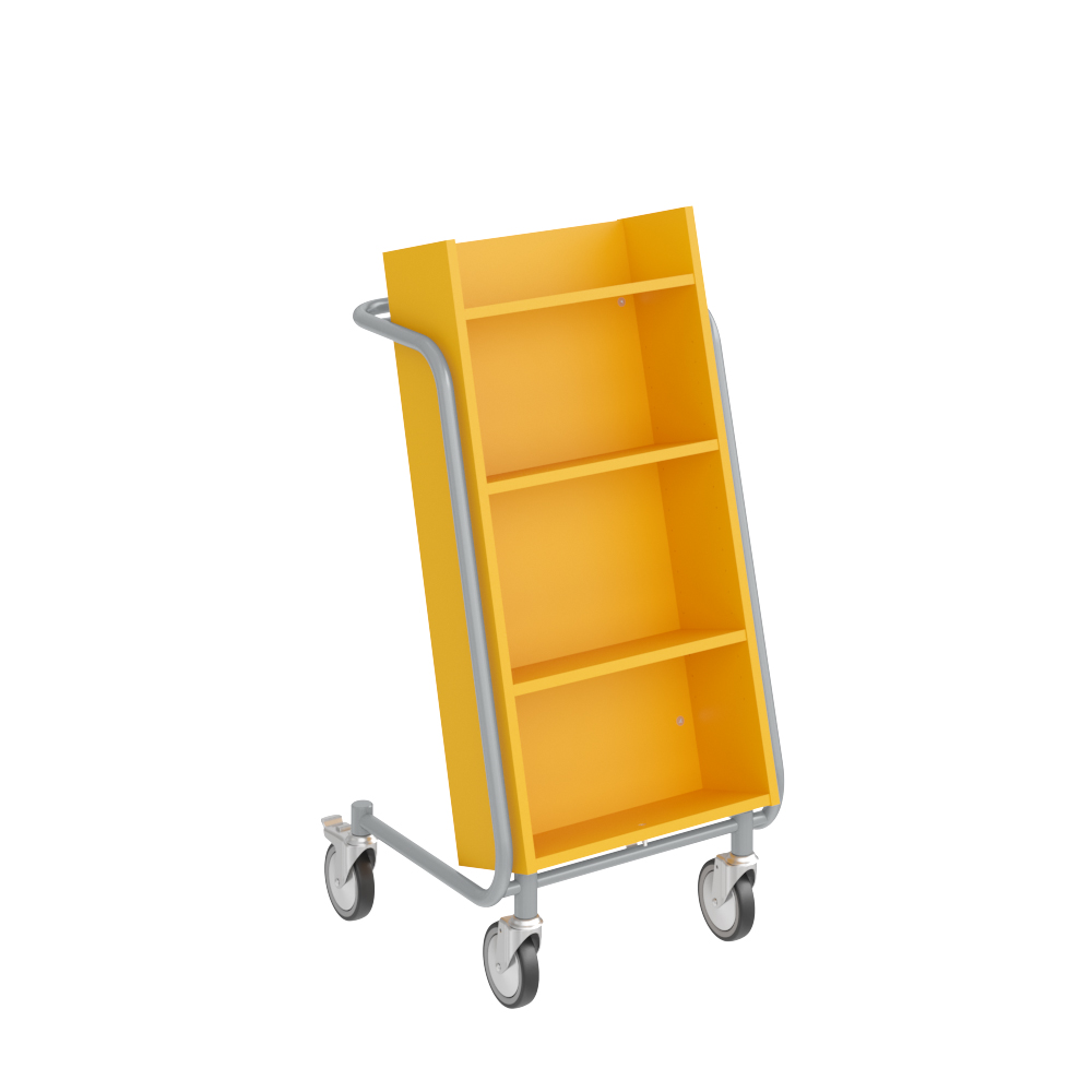 User-friendly, single-sided book trolley with 4 shelves. The two middle shelves are adjustable to accommodate various media sizes.