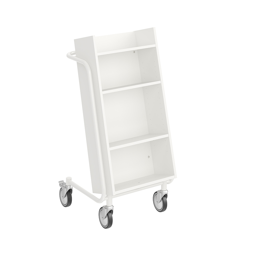 User-friendly, single-sided book trolley with 4 shelves. The two middle shelves are adjustable to accommodate various media sizes.