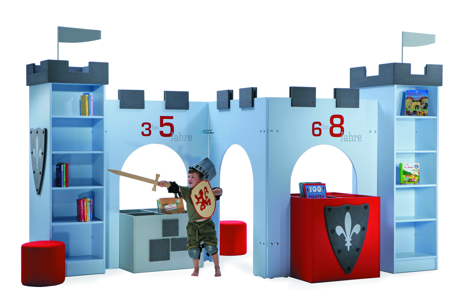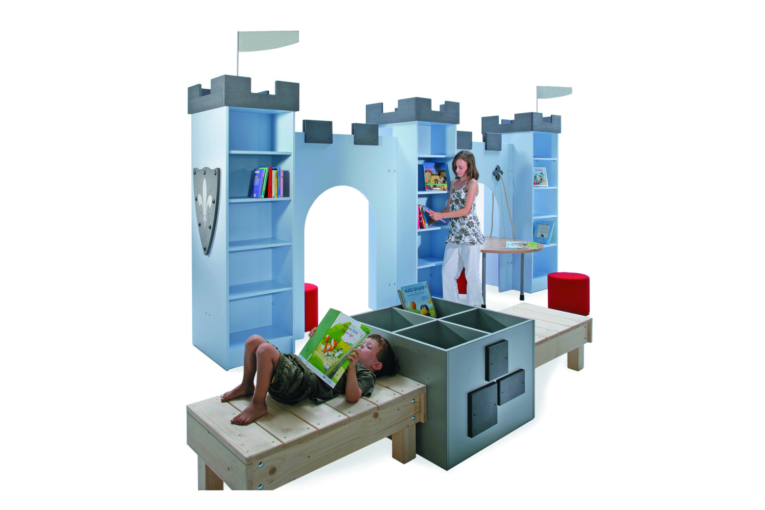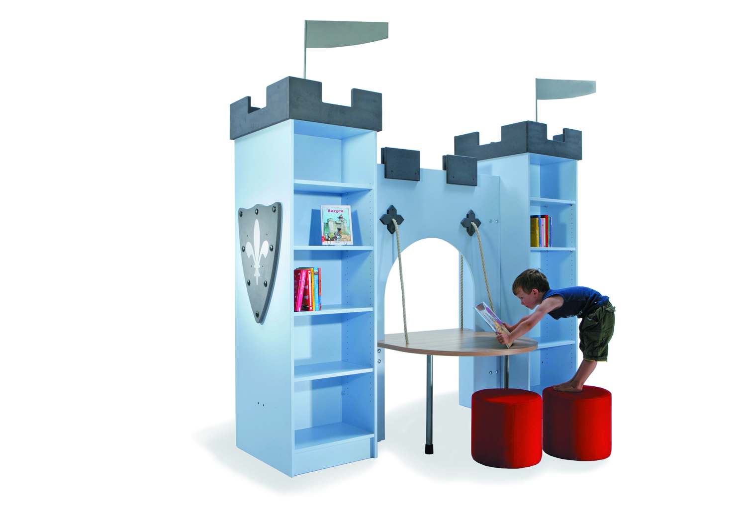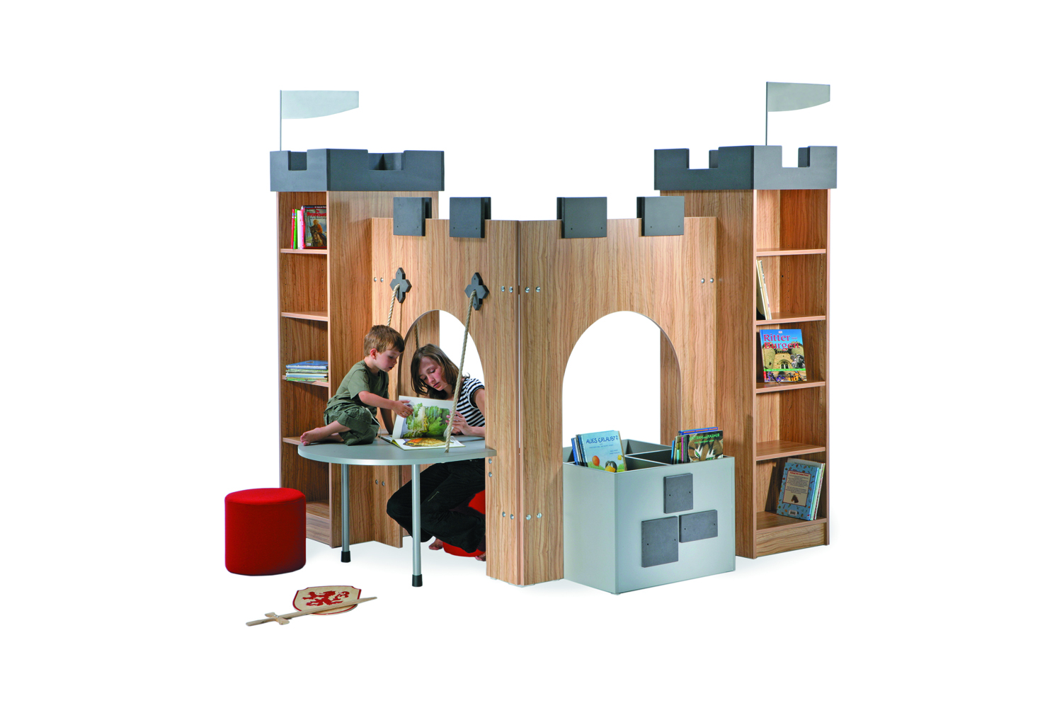 The castle is perfect for storing books on either side of the towers and the sturdy drawbridge-shaped table creates a reading, play and work space fit for a king or queen. The castle towers and archway can be combined in several ways and the open archway can be fitted with seat pillars, seat cushions or picture boxes in different heights to accommodate various age groups.