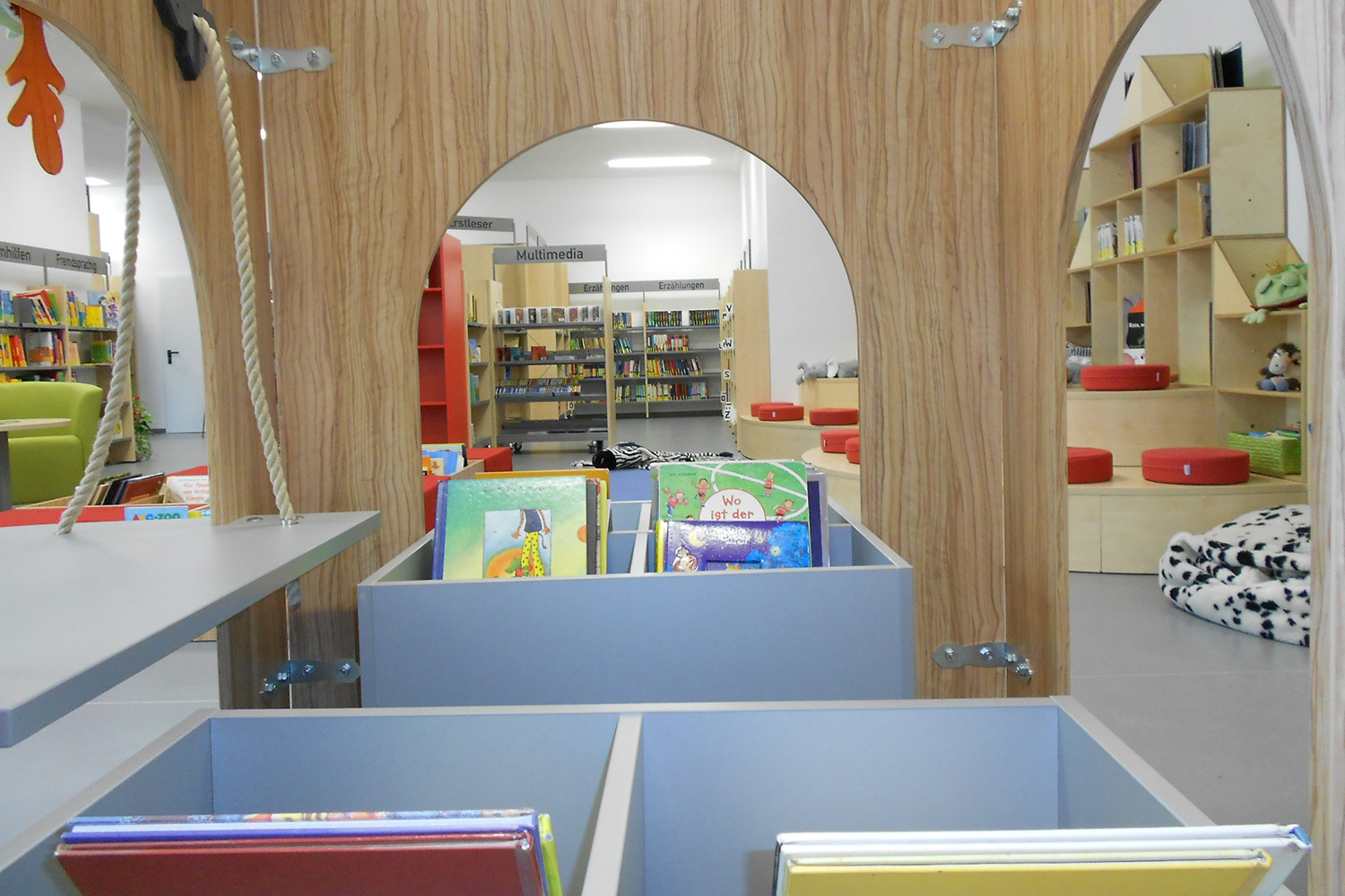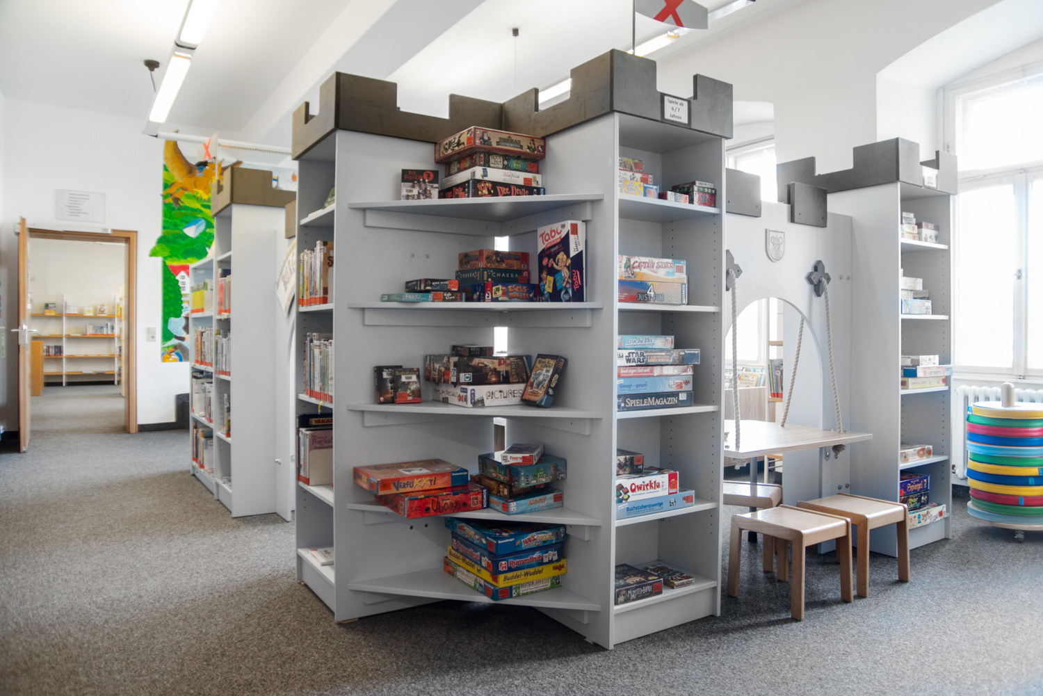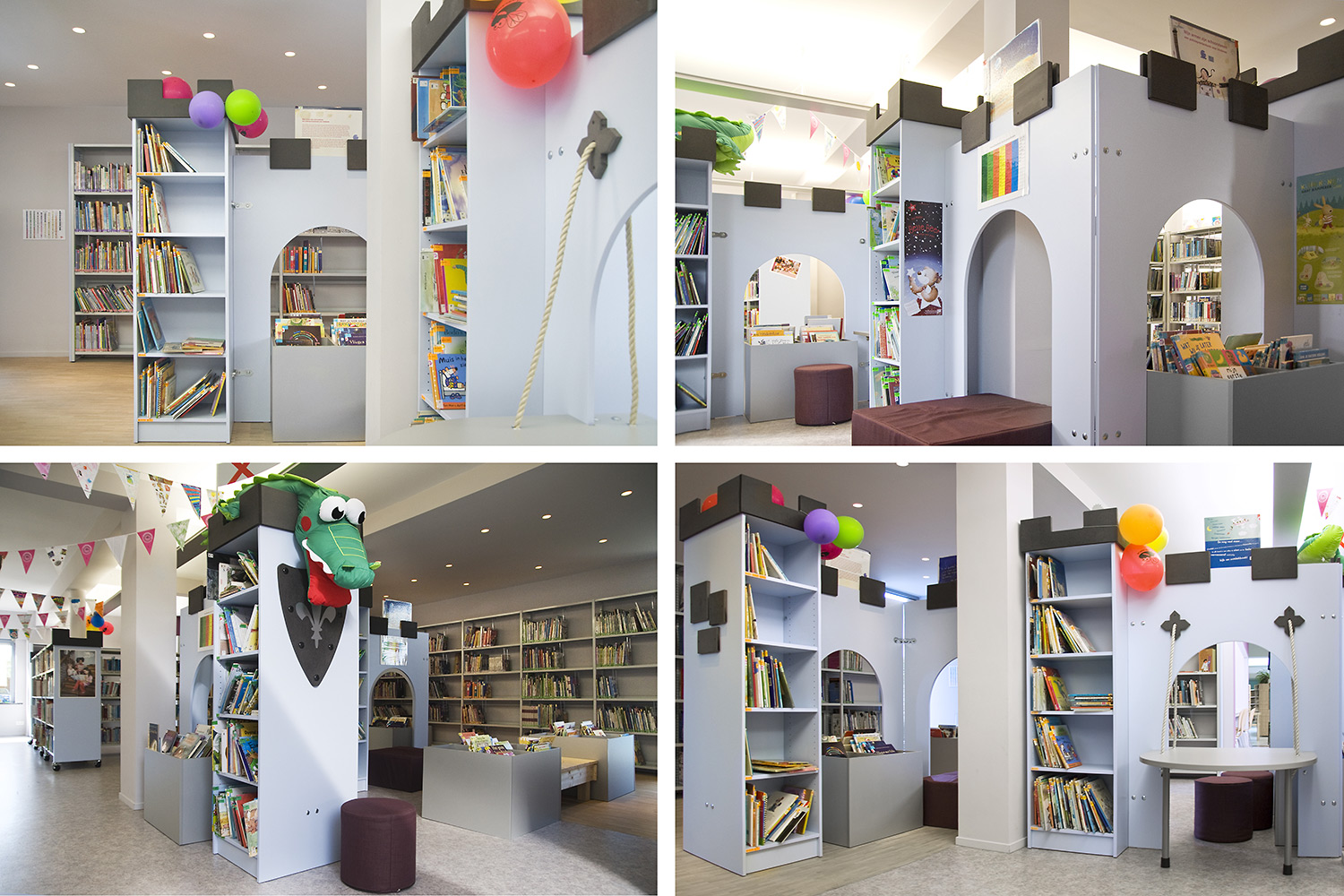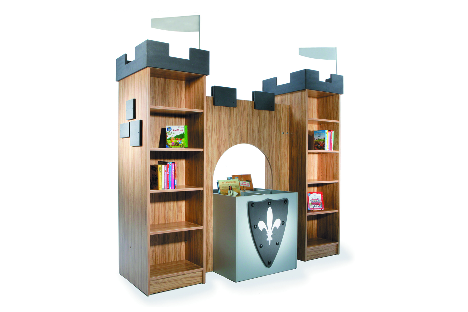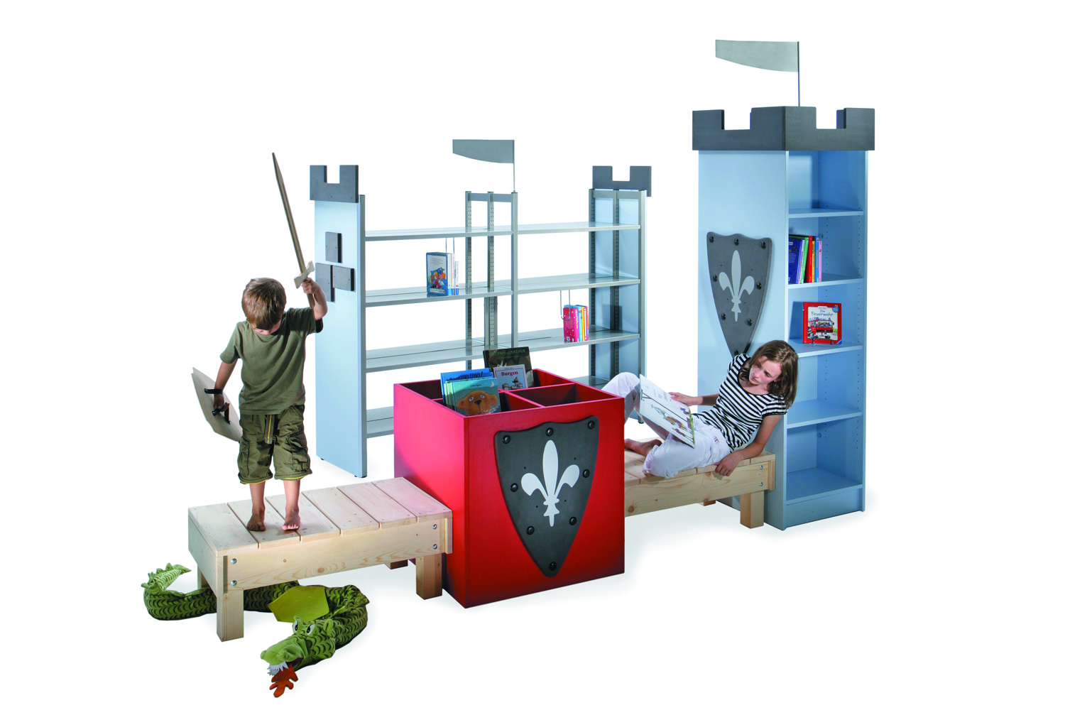 The castle is perfect for storing books on either side of the towers and the sturdy drawbridge-shaped table creates a reading, play and work space fit for a king or queen. The castle towers and archway can be combined in several ways and the open archway can be fitted with seat pillars, seat cushions or picture boxes in different heights to accommodate various age groups.