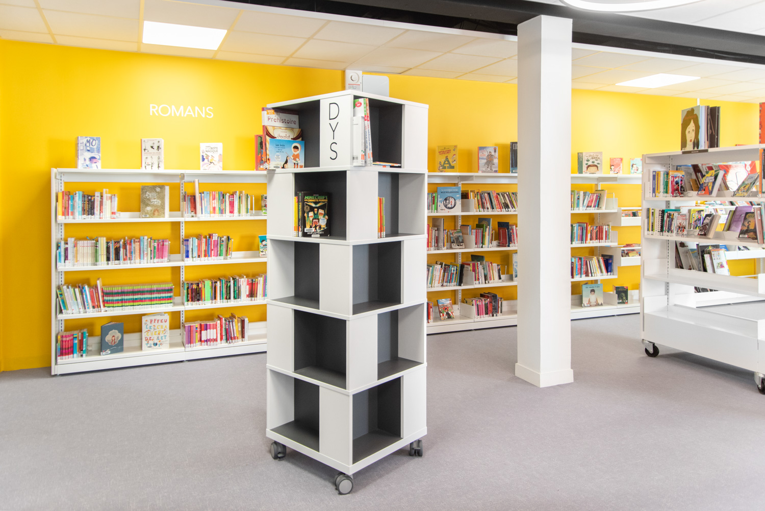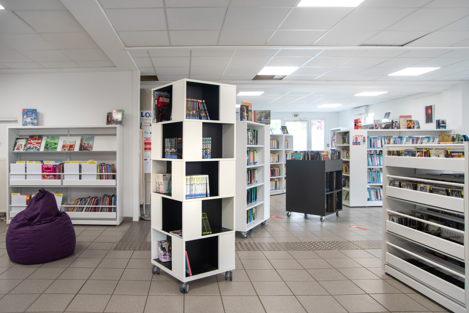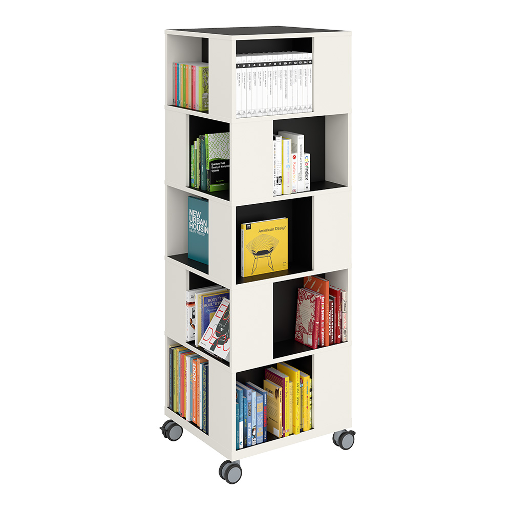 Freestanding mobile tower combining display with storage. Good capacity with 4 compartments per level.