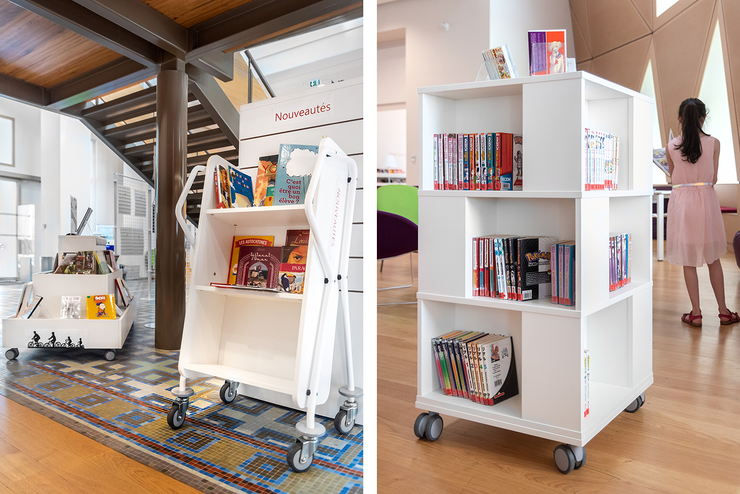 Freestanding mobile tower combining display with storage. Good capacity with 4 compartments per level.