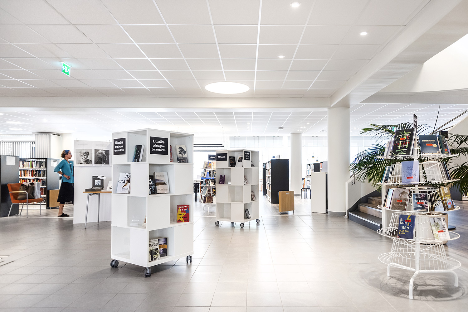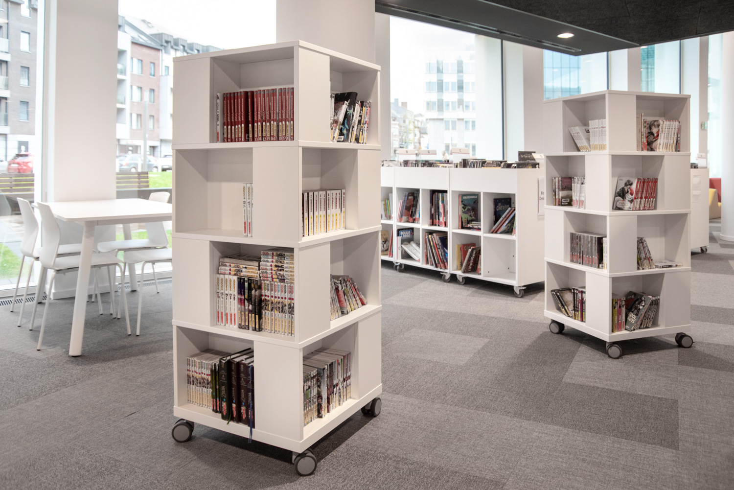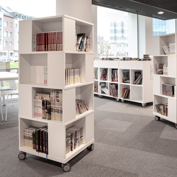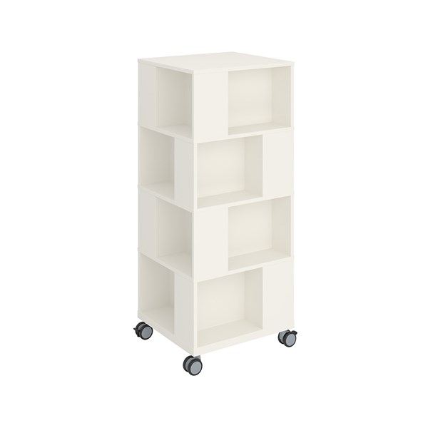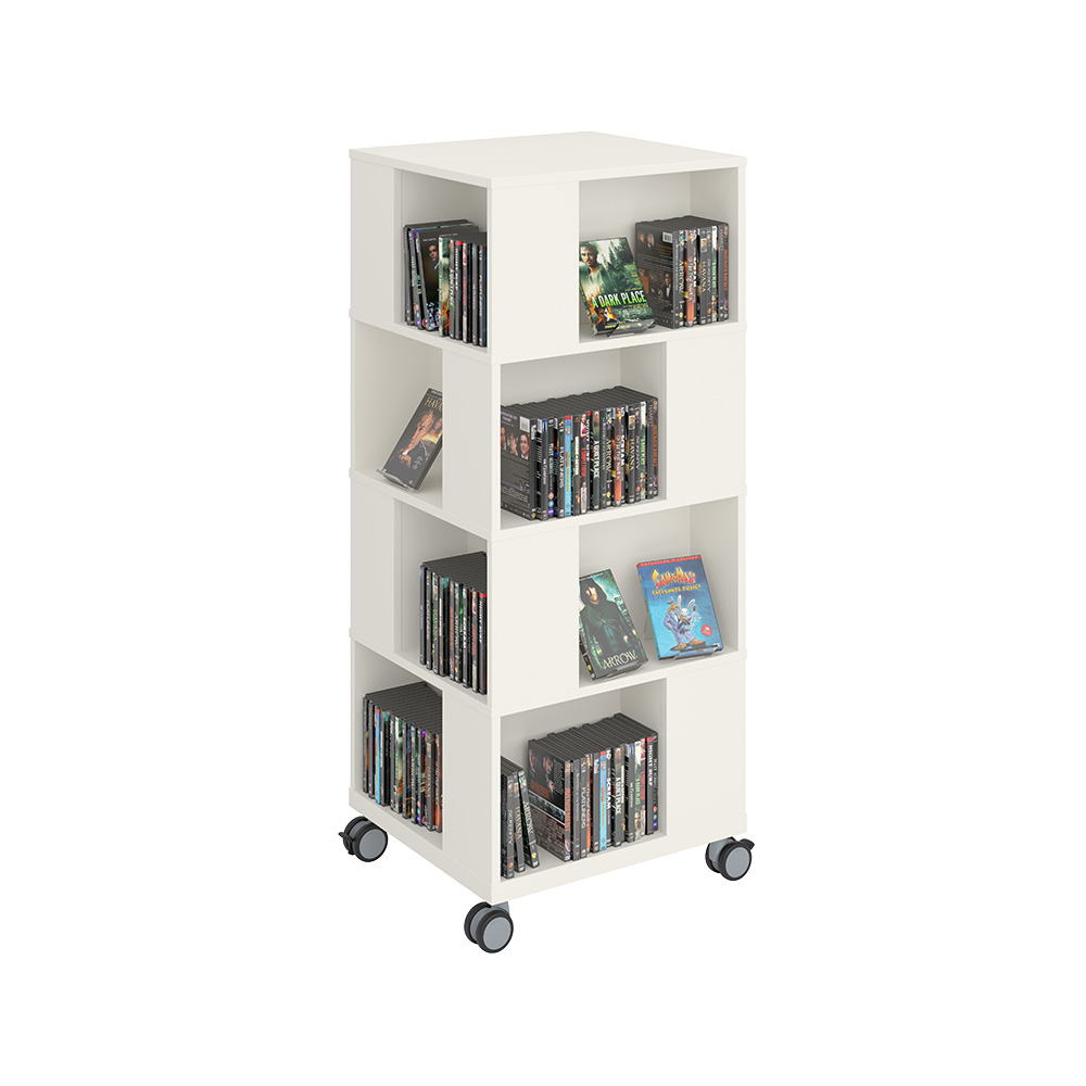 Freestanding mobile tower combining display with storage. Good capacity with 4 compartments per level.