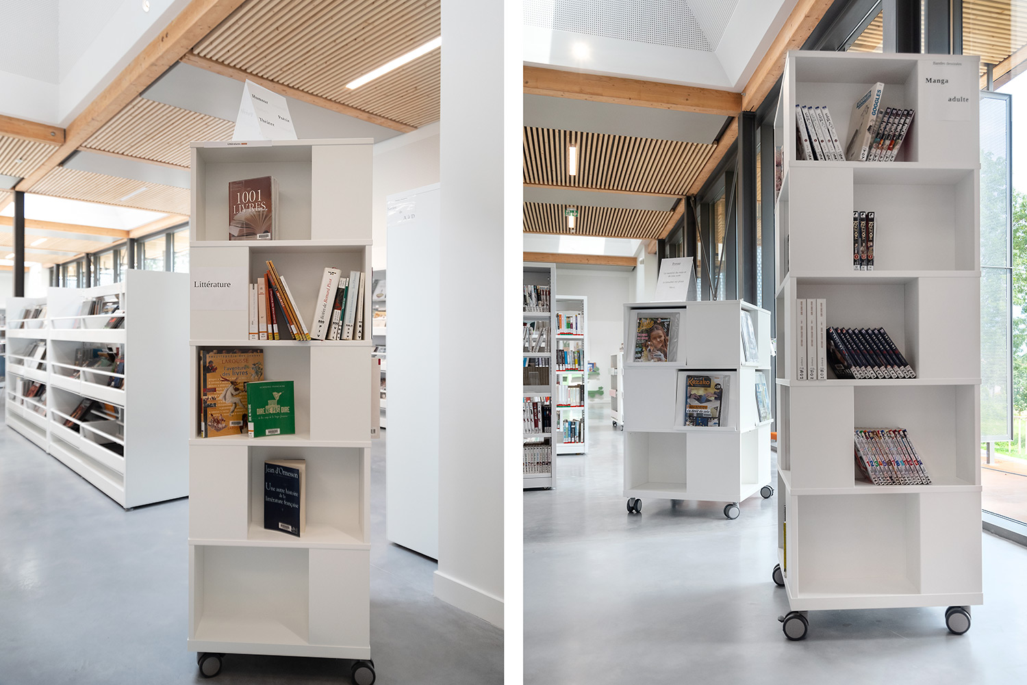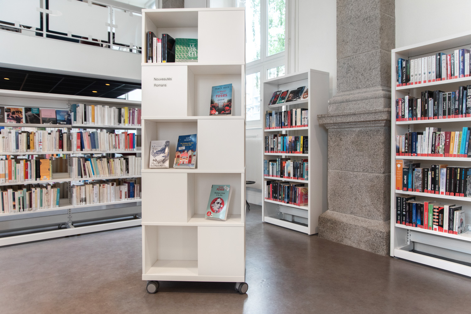 Freestanding mobile tower combining display with storage. Good capacity with 4 compartments per level.