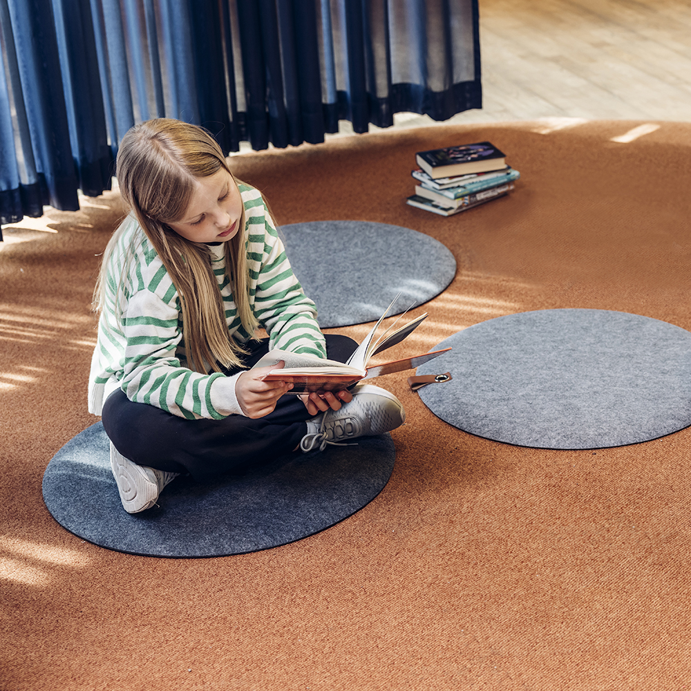 Durable, pressure relieving, felt floor cushion with non-slip bottom that reduces acoustics in the children's area and encourages learning and play.