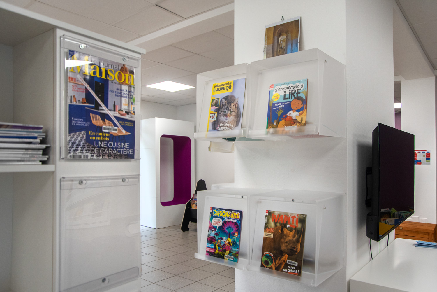 Acrylic magazine boxes for displaying and storing magazines.