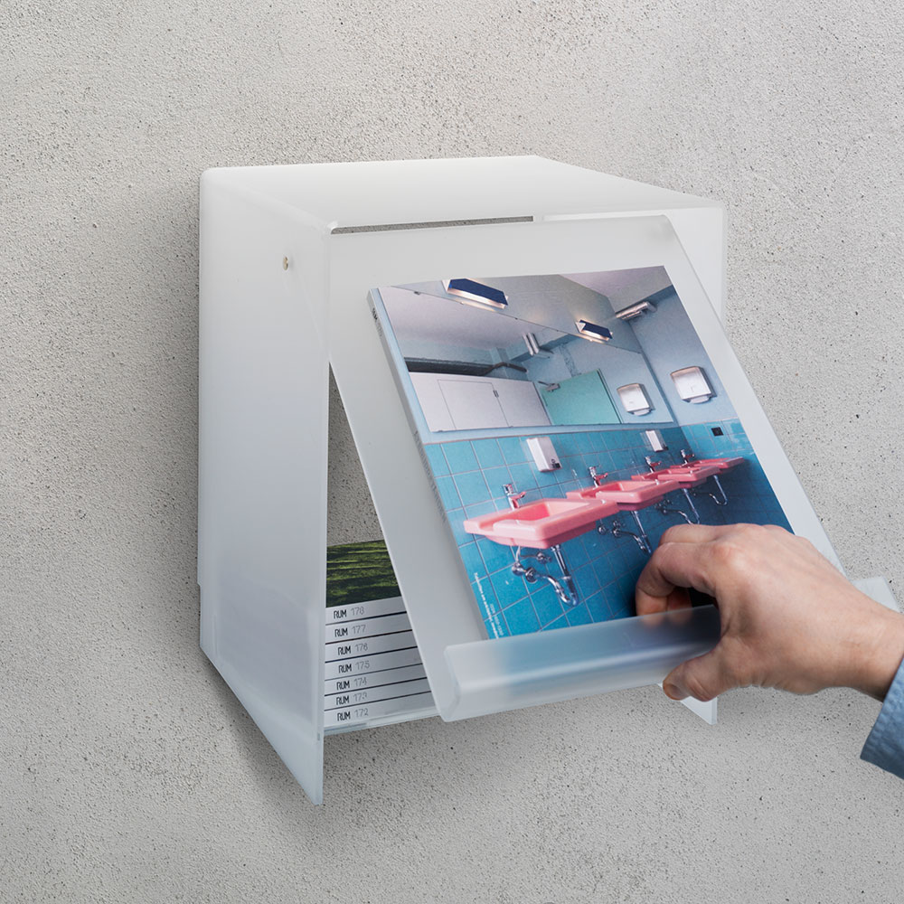 Current magazines and periodicals are stored in a compartment behind the flap (lift and insert) and the fold-down lid also serves as a display holder for the latest issues.
