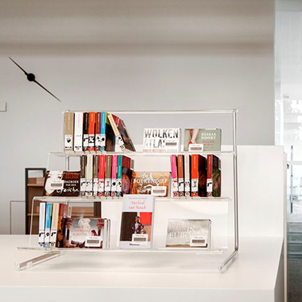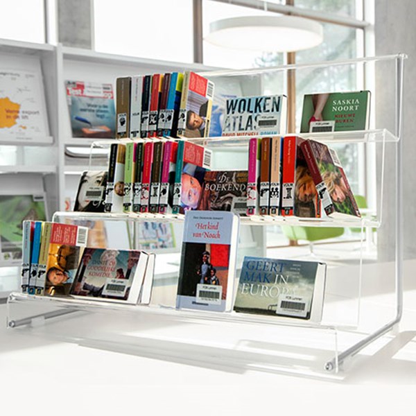 Freestanding, single-sided, 3-tier stand for forward-facing display of books.