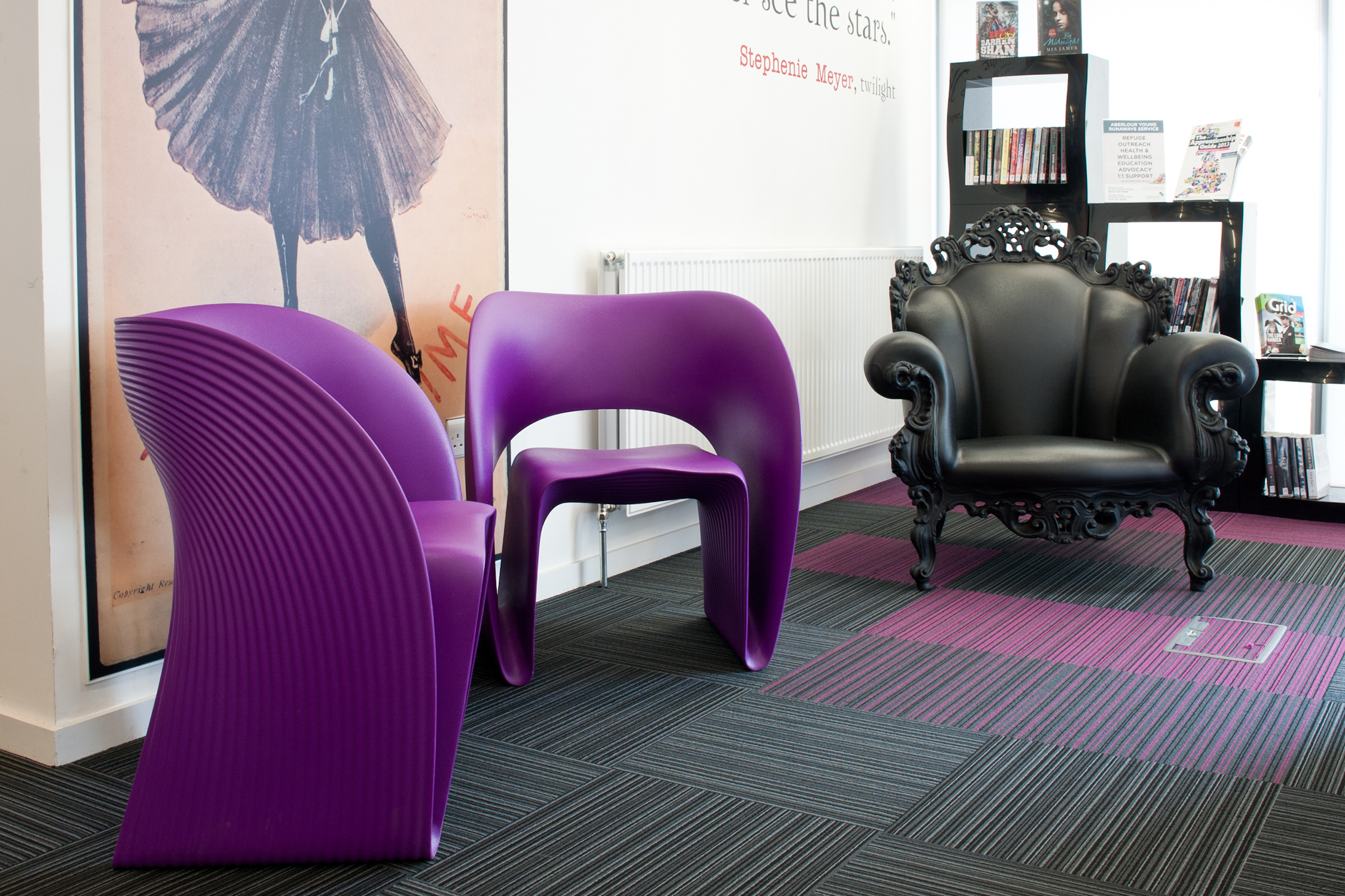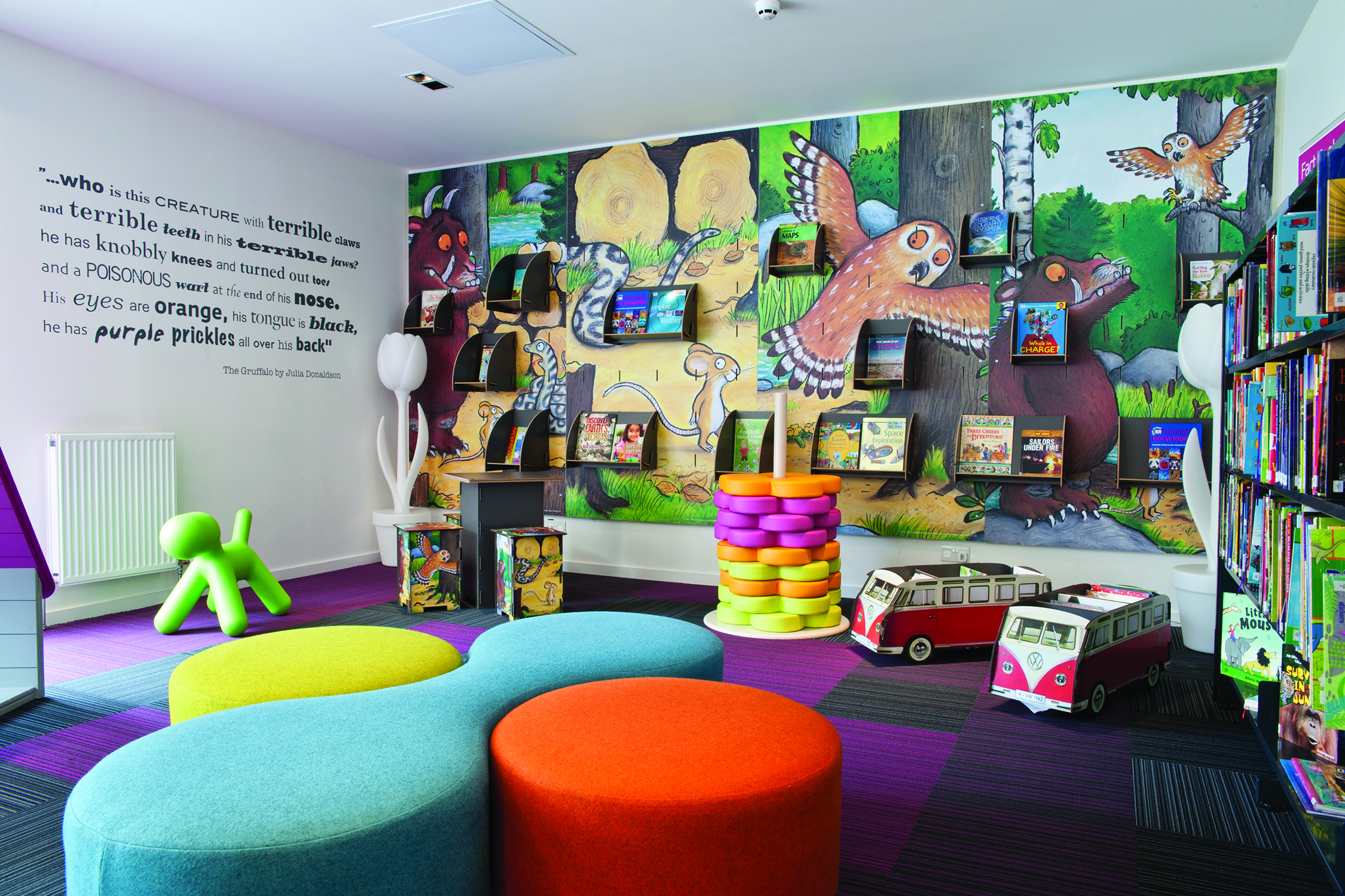 The key themes and zones of the library are enhanced by the use of graphics and signage with permission of children's laureate Julia Donaldson, her popular Gruffalo images was used as a wall graphic in the kids section, and this theme continues through to the bespoke mini furniture.
