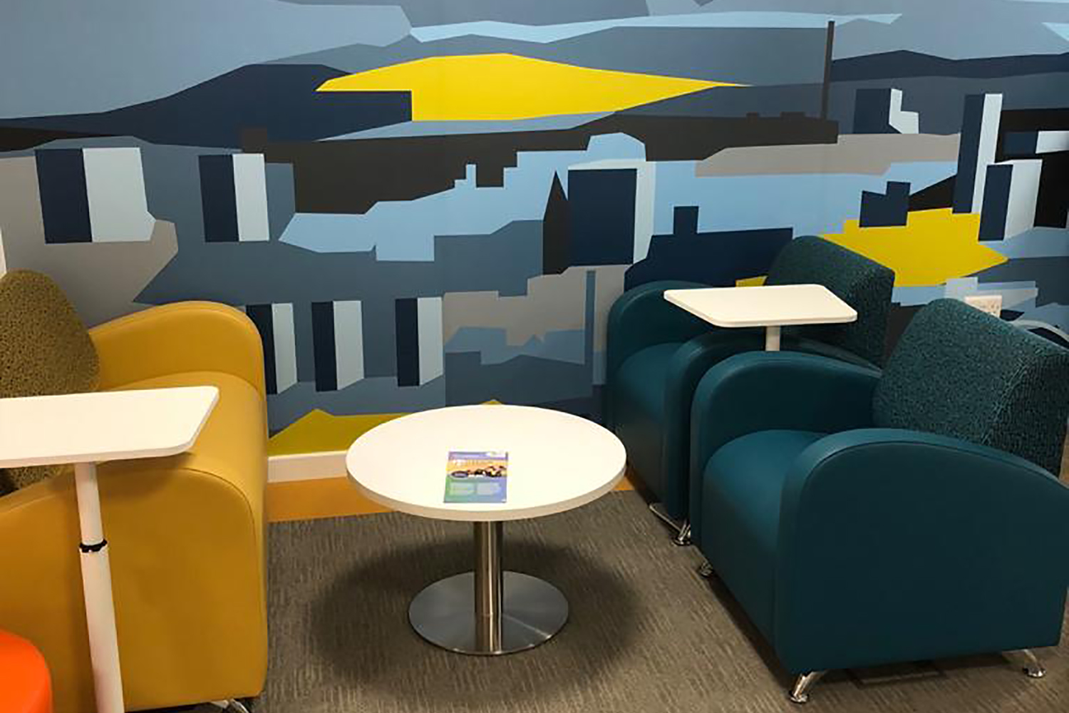 We also designed a bespoke graphics package for the library, highlighting the beauty of the view of the Campsie Fells from the Cathkin Braes where the library sits.