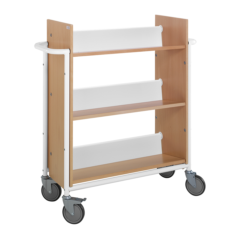 Functional, single-sided trolley with 3 fixed reverse tilted shelves which ensures safe media storage.