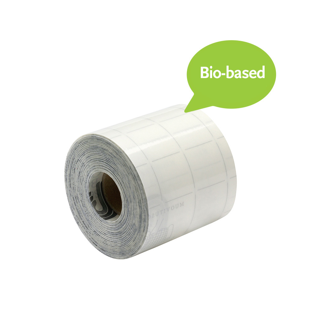 The self-adhesive, glossy protection tape is made of bio-based plastic (75% sugar cane) and water-based acrylic adhesive.