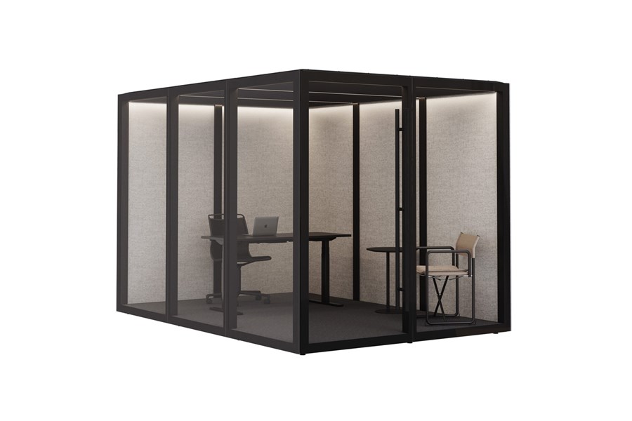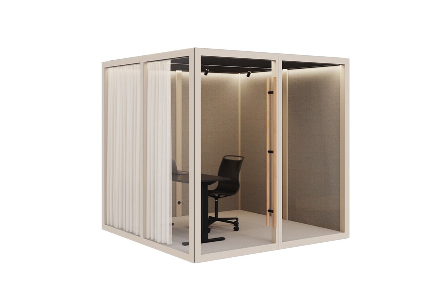 Zen Pod® combines advanced sound-absorbing technology with elegant design. Two walls feature acoustic glass, while the remaining walls are sound absorbing and clad in textile on both inner and outer sides. The ceiling also offers sound insulation with pleasant lighting.