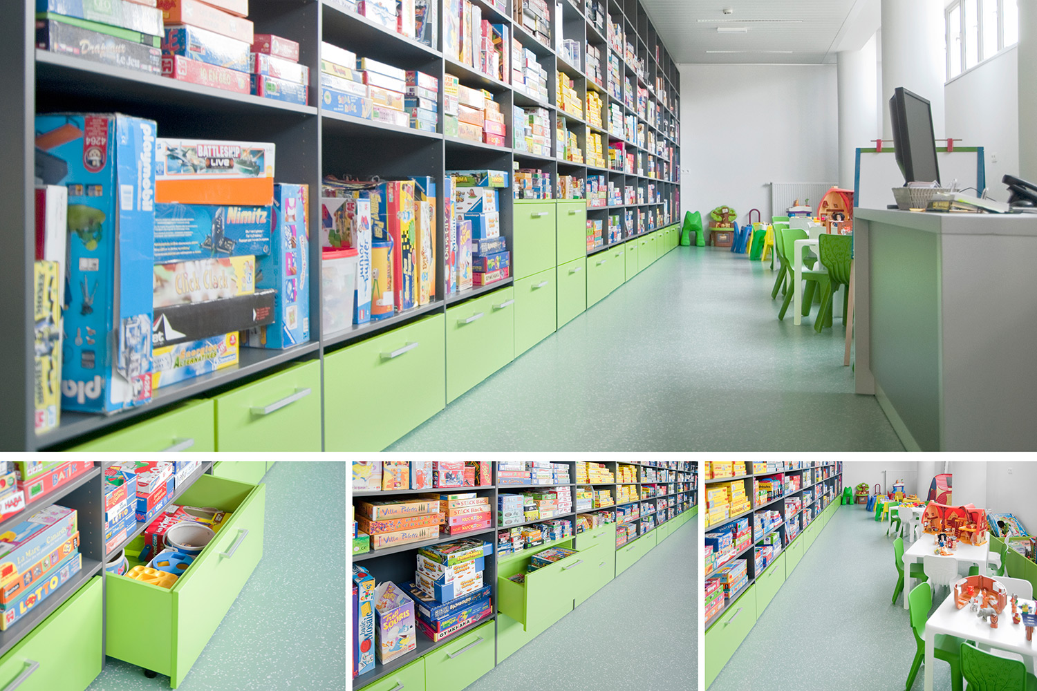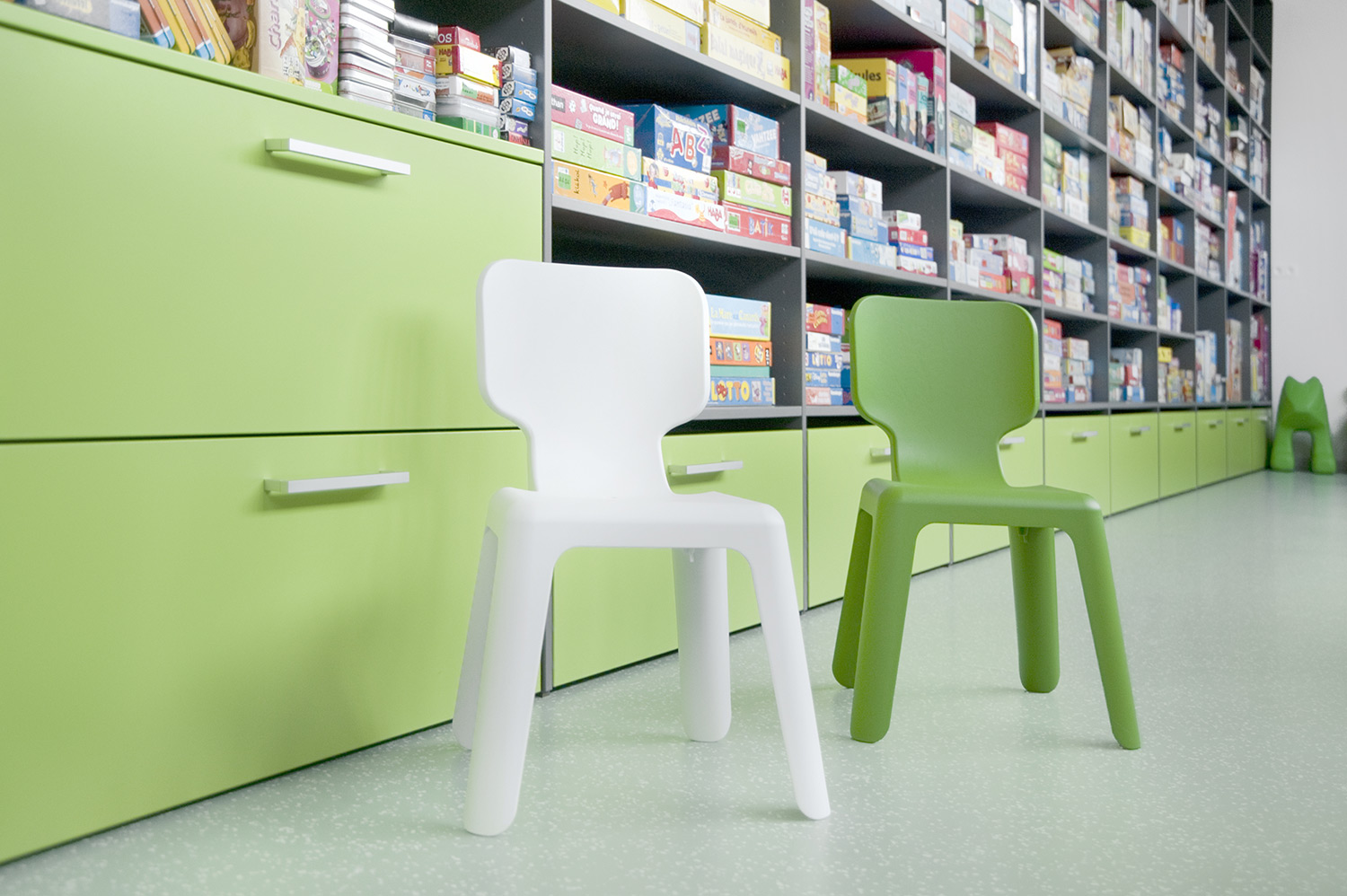 The Uniflex library system fitted with varying acrylates, a playful children's corner and games library complemented by comfortable seating and study areas make this library a warm place for its visitors and employees.