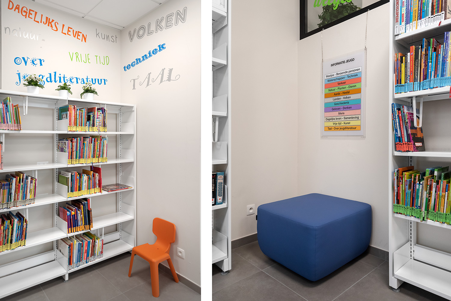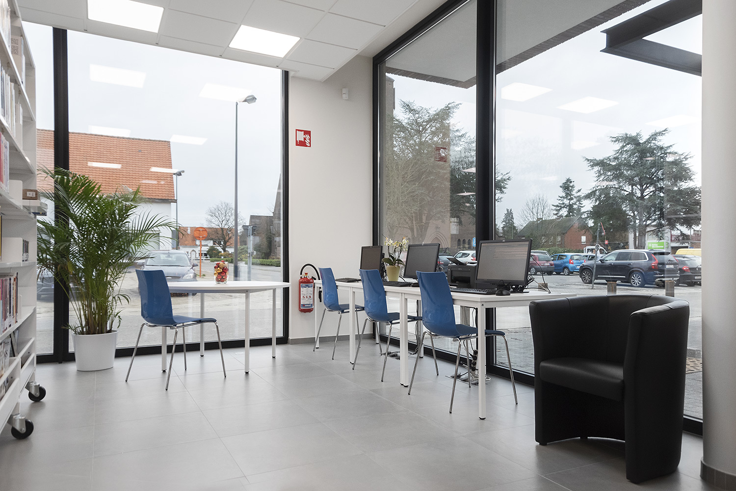 The Begijnendijk library wants to be more than a mere collection of books. Councilor Bob Michiels points out the flexible design: "The furniture is so functional that it can be easily pushed aside to make room for lectures or other cultural activities". Both the shelving and the book browsers are equipped with wheels so that they can be easily moved. Mr Fred De Keyser, chairman of the library board, is also pleased with the realization in the heart of the town. "A library should be at the forefront of the information revolution, and the new building and the whole new concept were the perfect occasion to set the right lines: becoming a meeting and experience center with room for modern media and techniques".