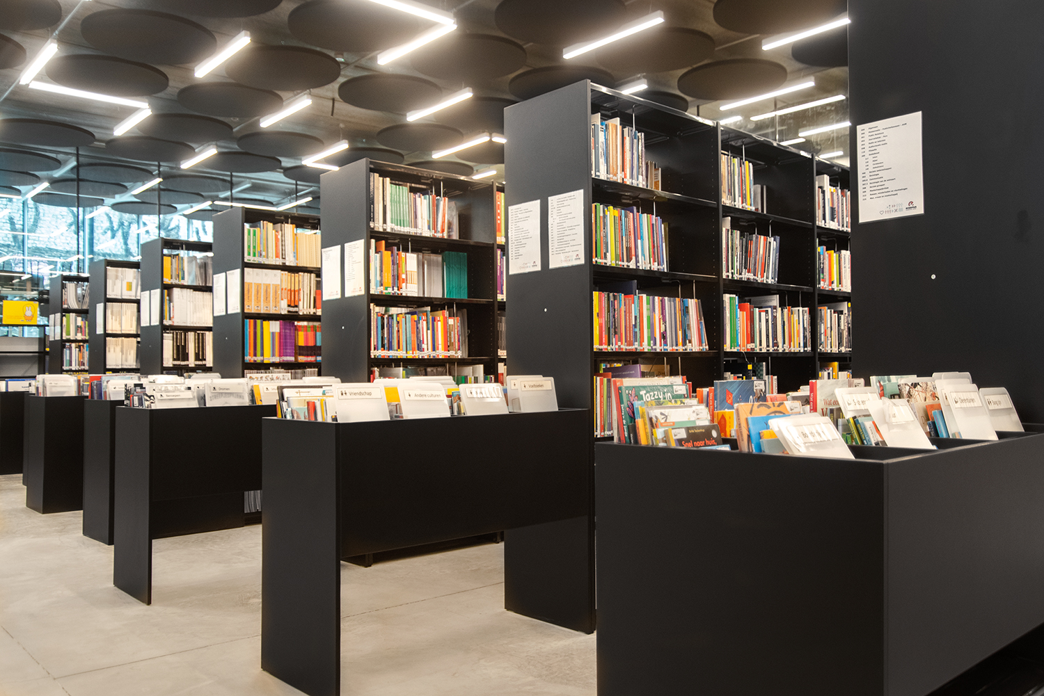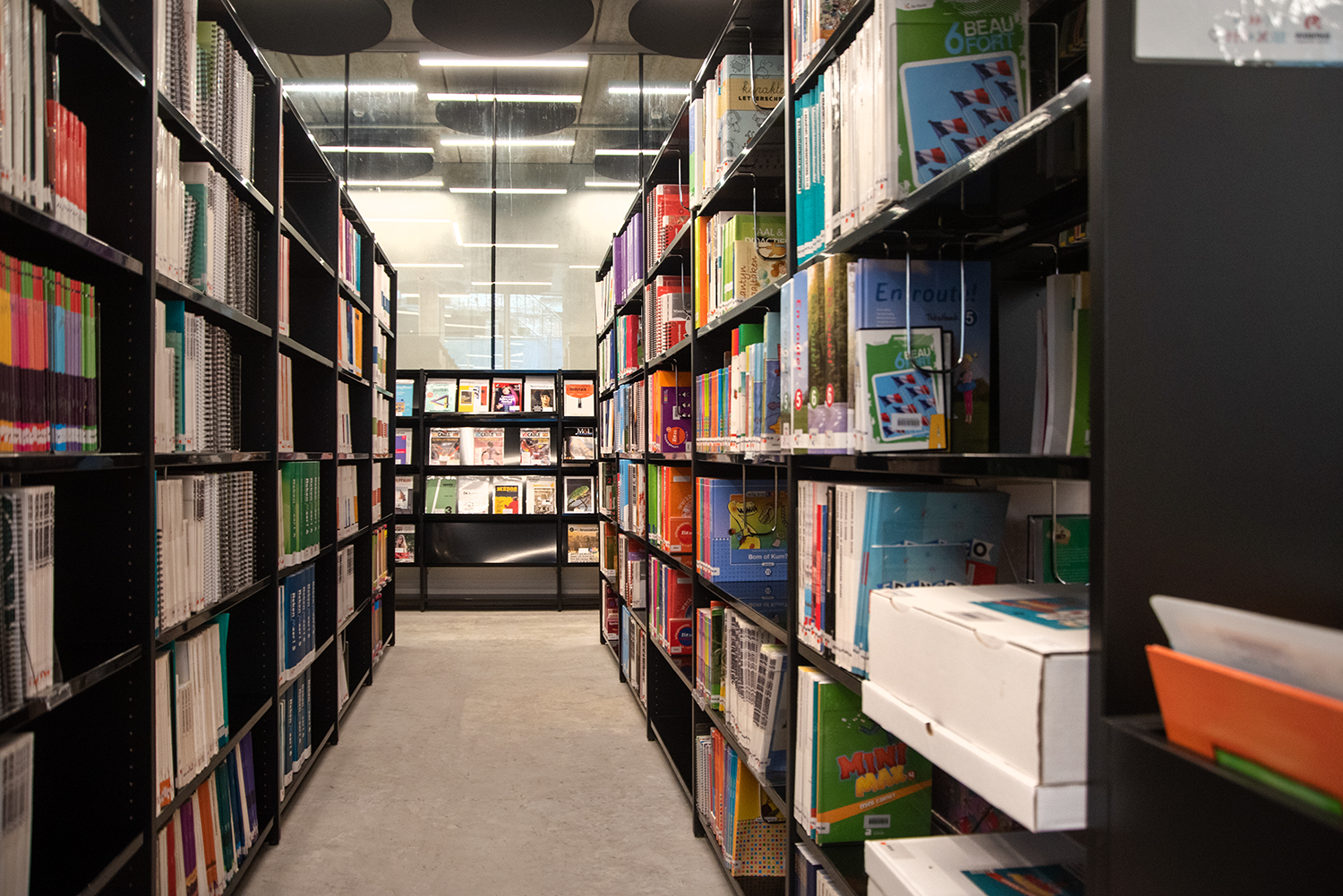In a trendy and lively neighbourhood in Brussels, close to the canal, the Erasmus Hogeschool established its new campus Kanal. The transparent character is striking: a glass facade around the building involves student life in the neighborhood and vice versa. On the ground floor, the library is one of the eye-catchers in the interior. The black library shelving fits perfectly into the sleek, contemporary architecture of exposed concrete and wood and gives all the attention to the contents.