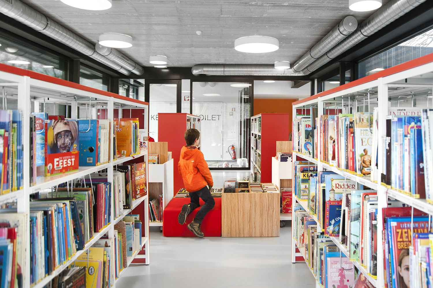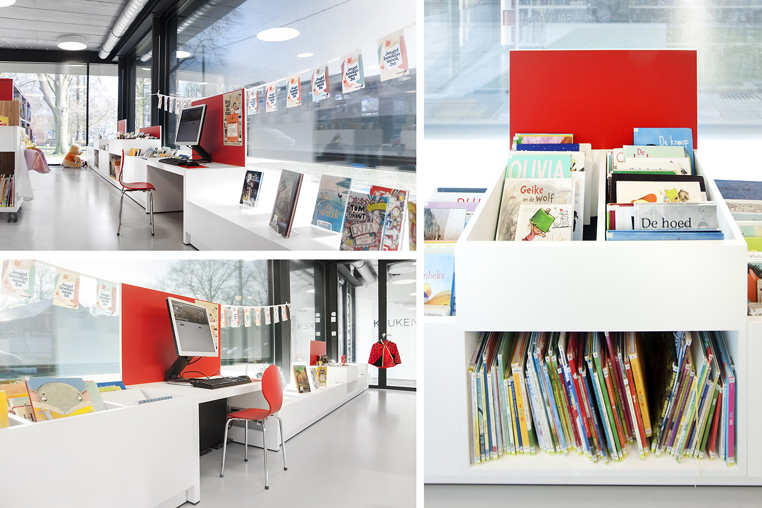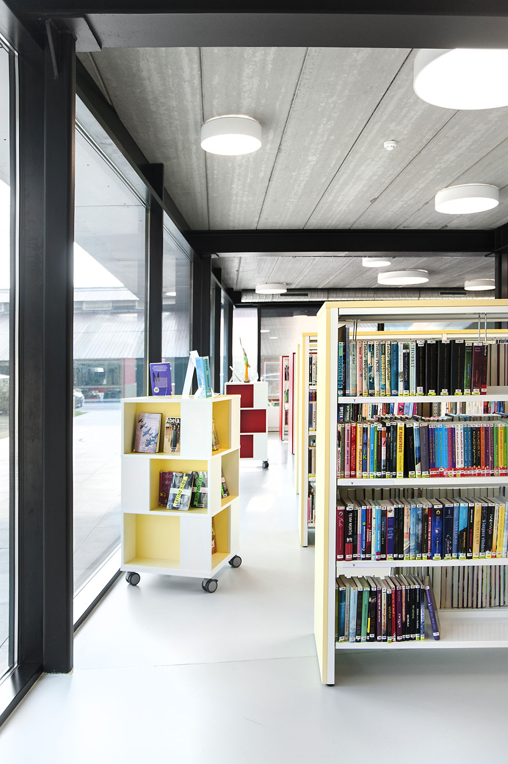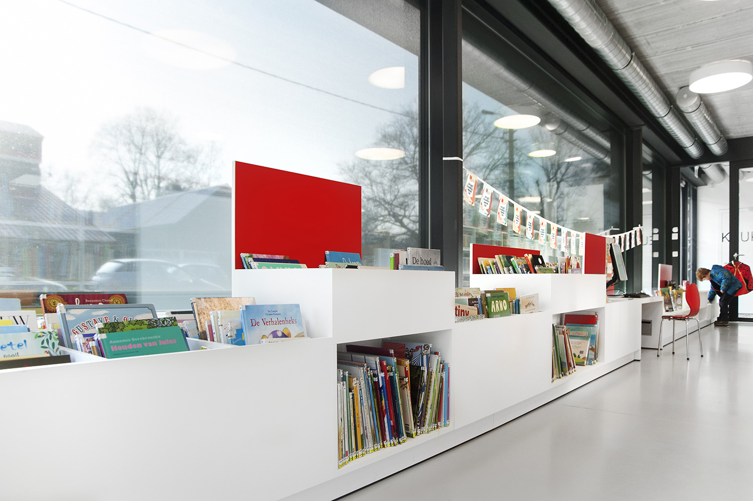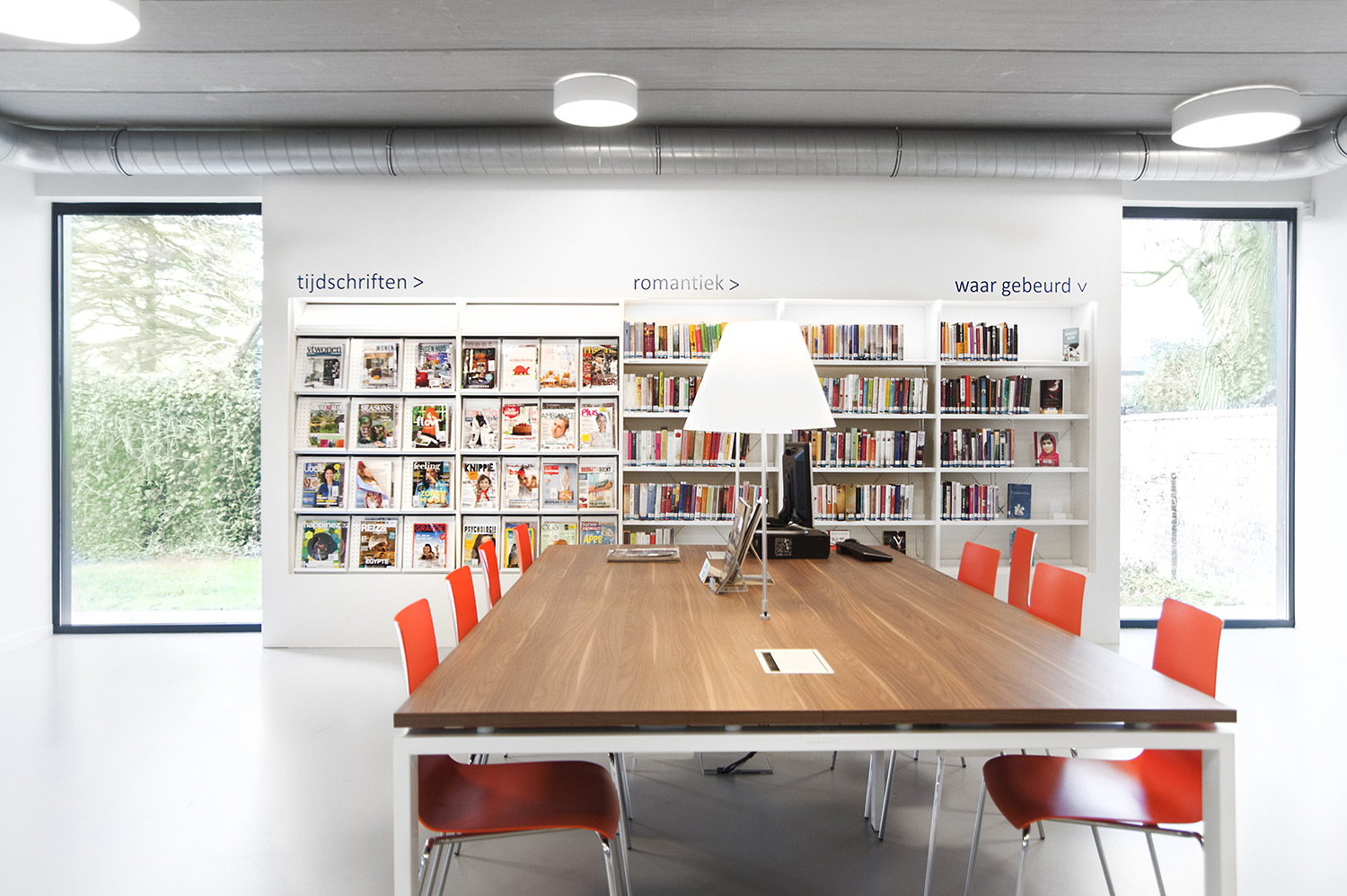 Abundant natural light and views to the park form the basis for a pleasant library in a modern, timeless design. Some colour accents make a link with the various target groups. Shelves were encased to maintain the tight design.