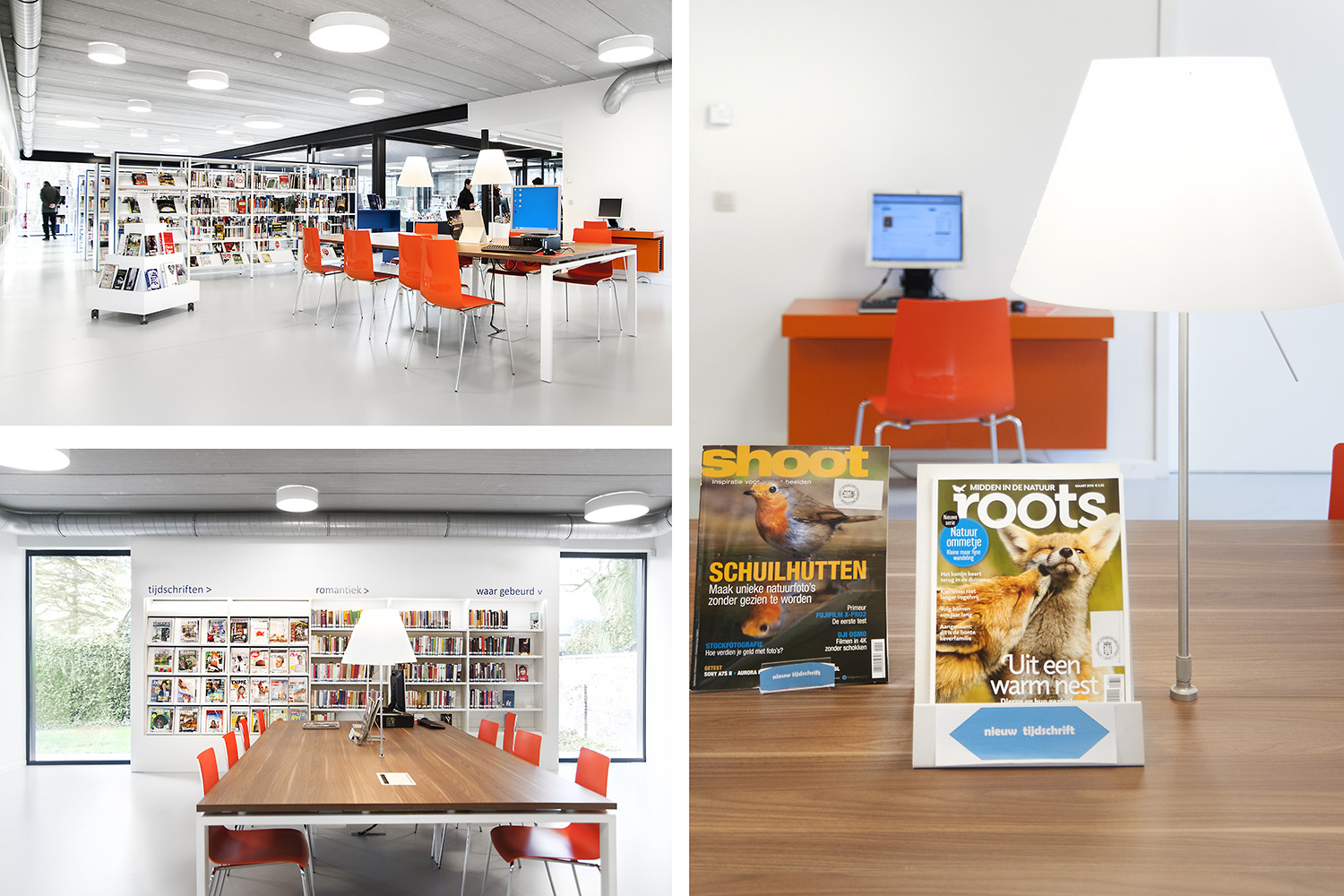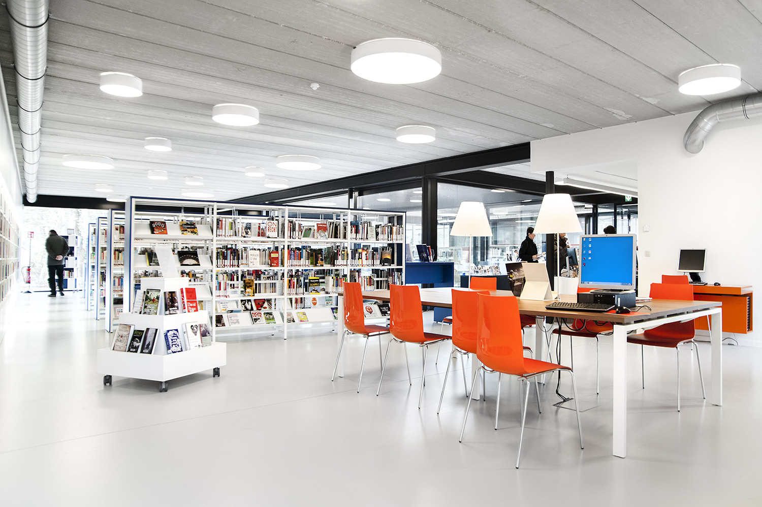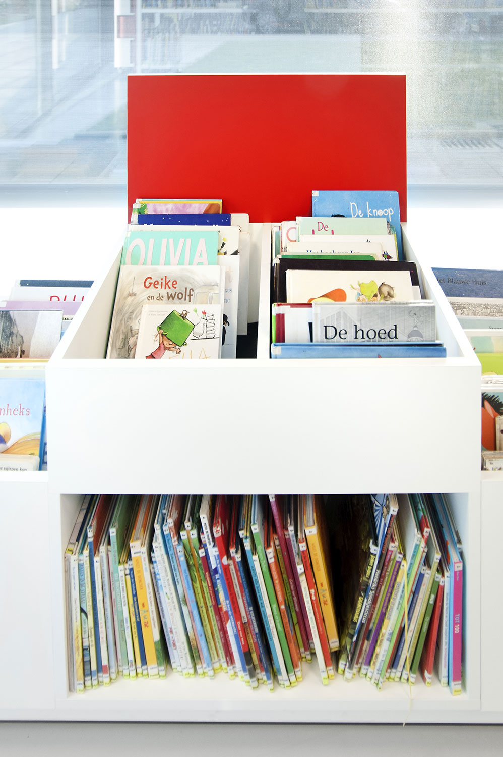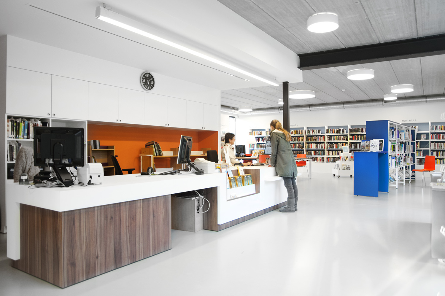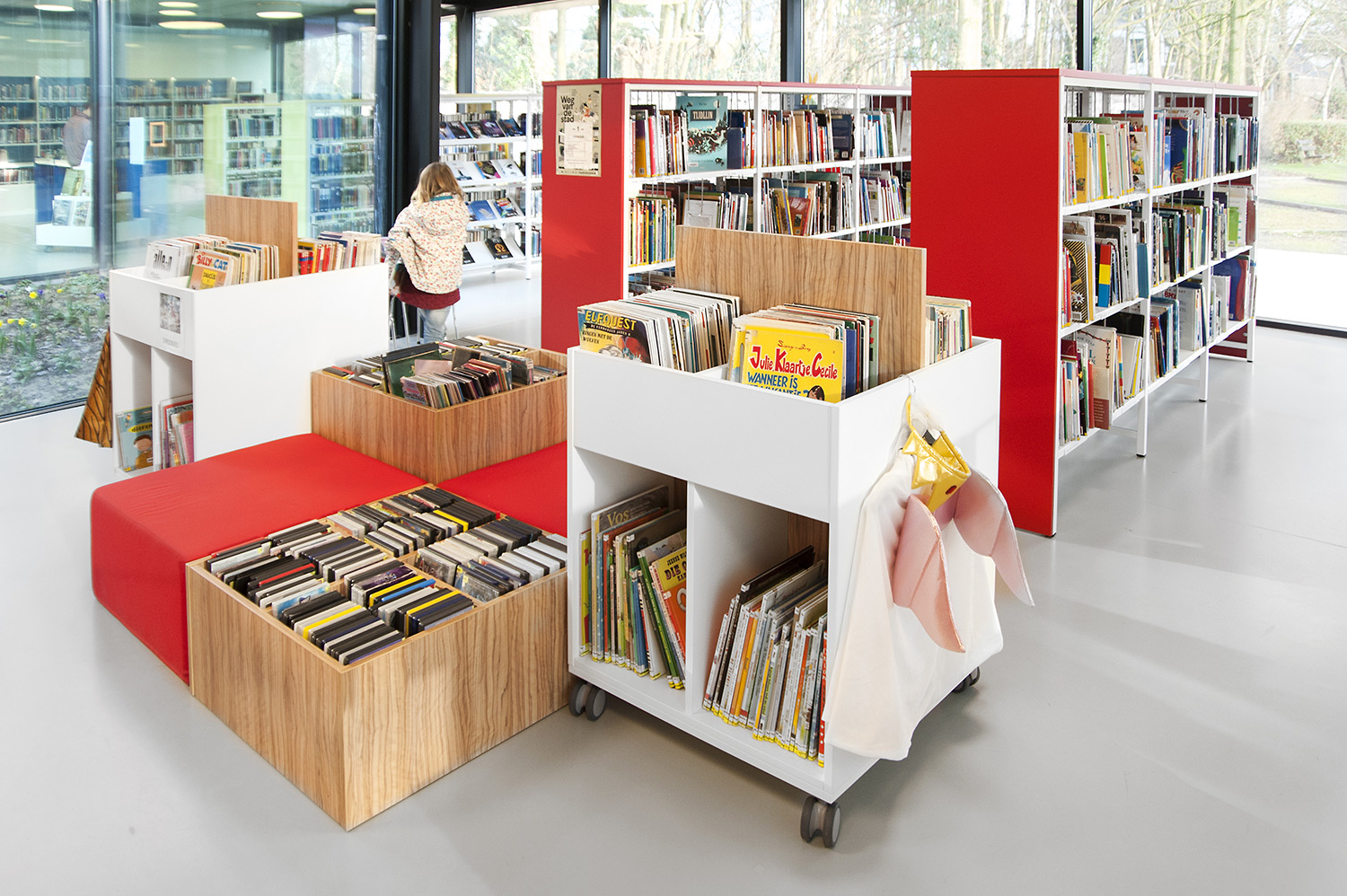 Abundant natural light and views to the park form the basis for a pleasant library in a modern, timeless design. Some colour accents make a link with the various target groups. Shelves were encased to maintain the tight design.