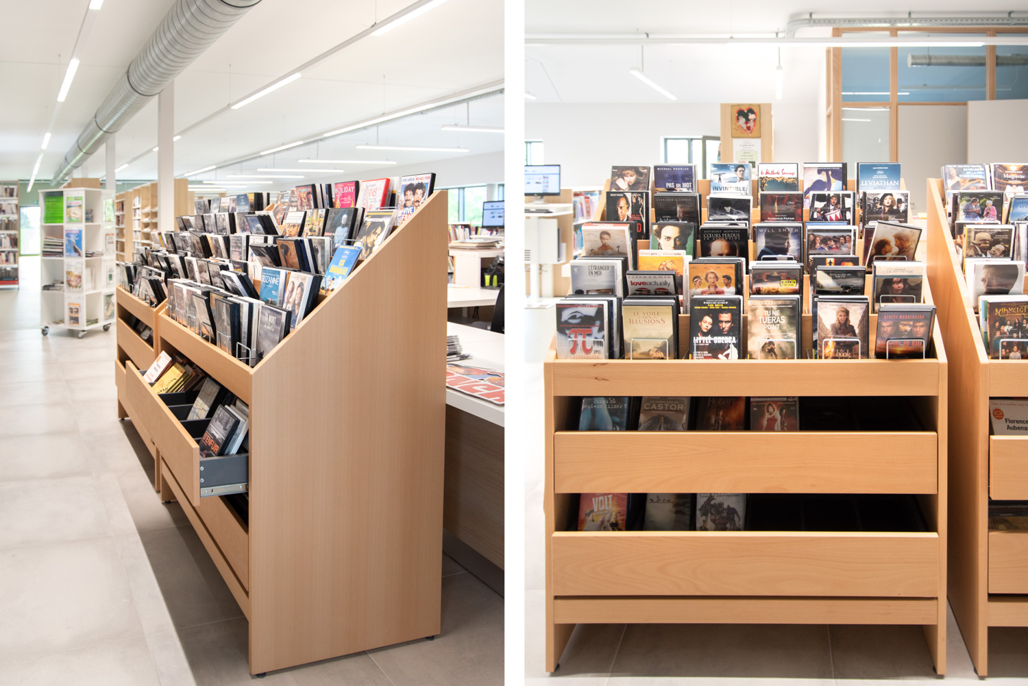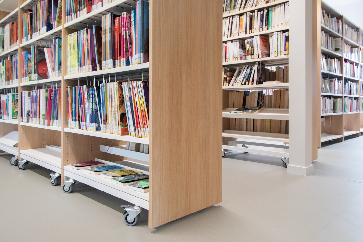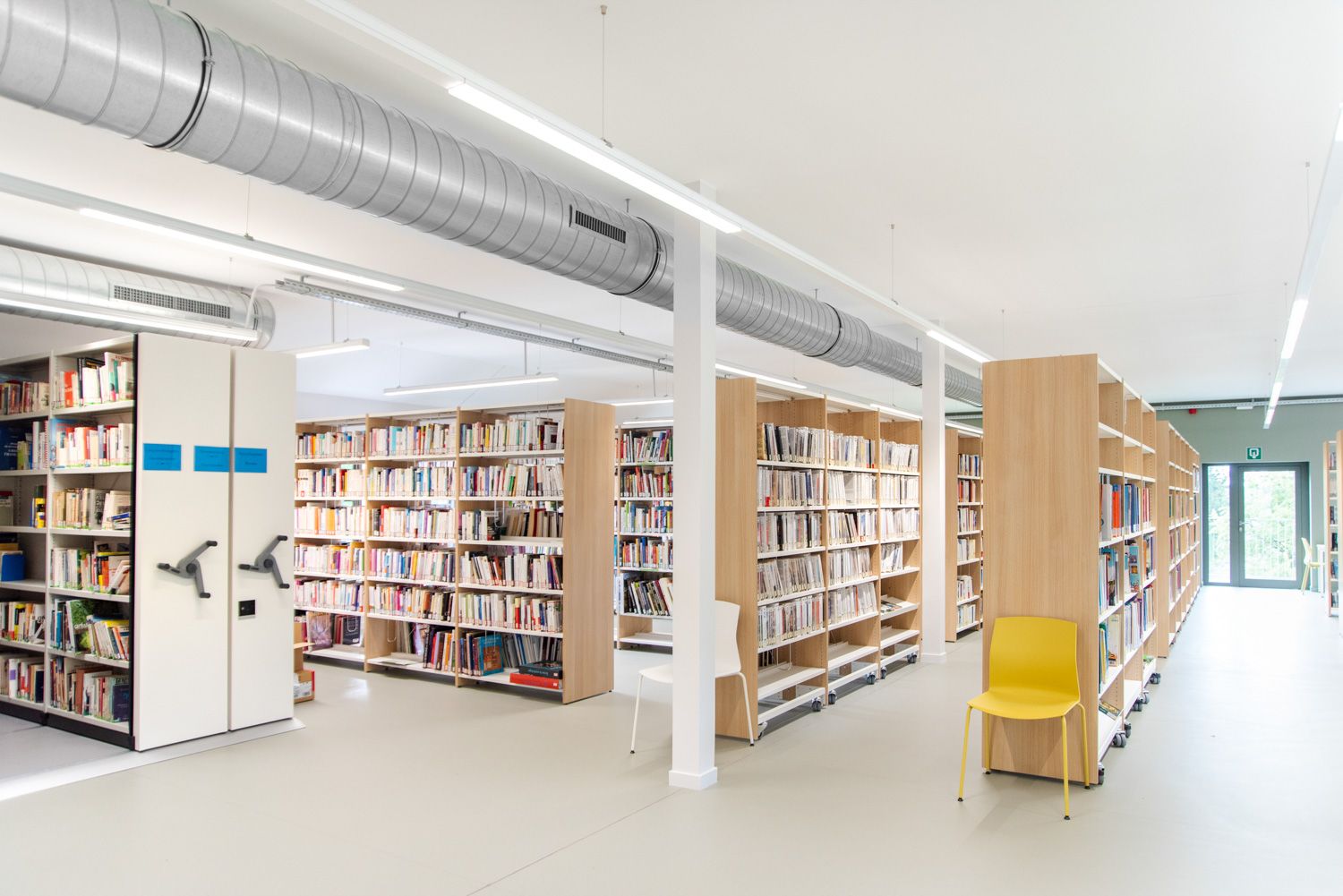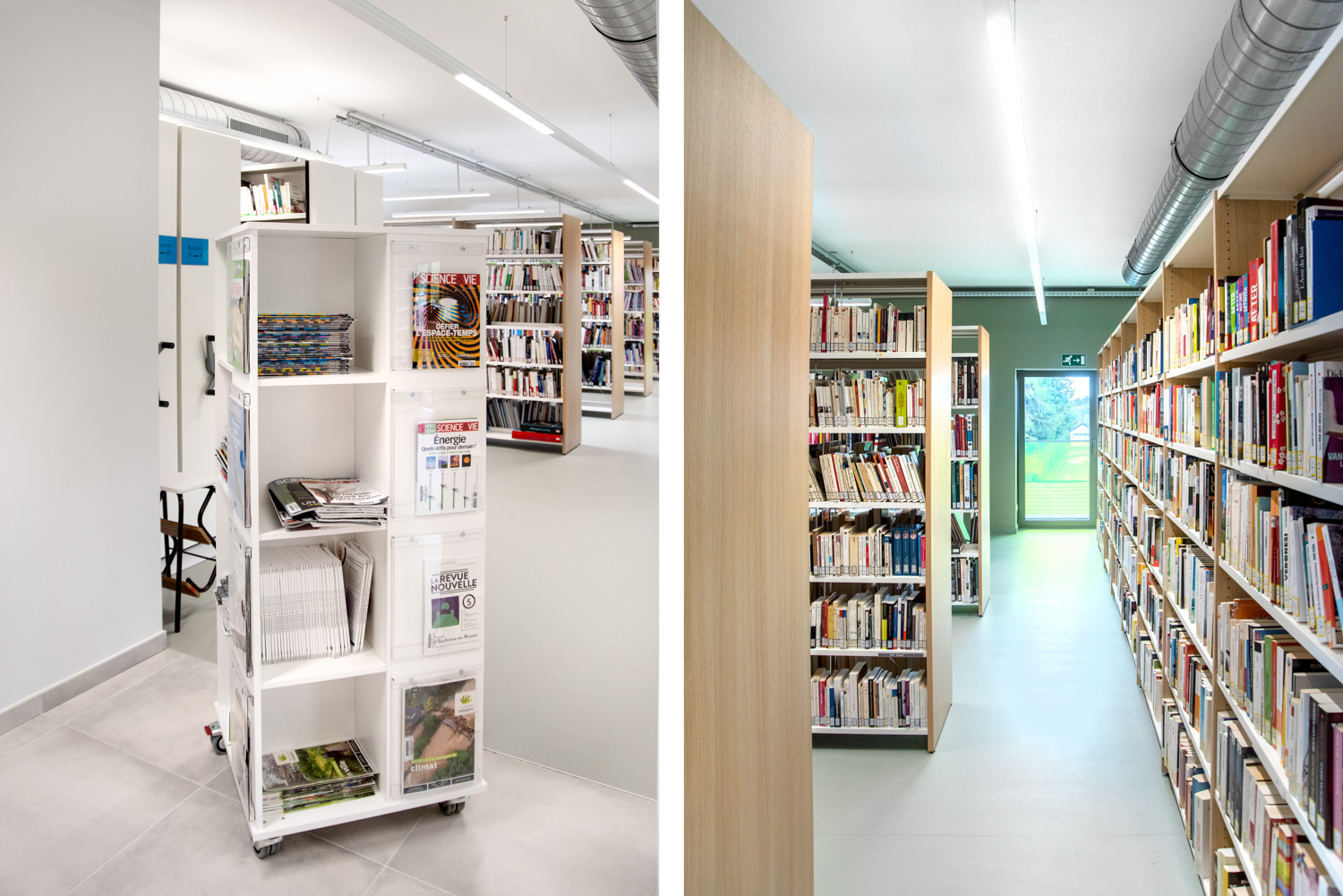 Florenville Public Library is part of a municipal project that aims to bring different users together in the same building. By the entrance is a spacious counter with easy access for people with limited mobility. The wooden shelving systems are nicely combined with colourful seating furniture.